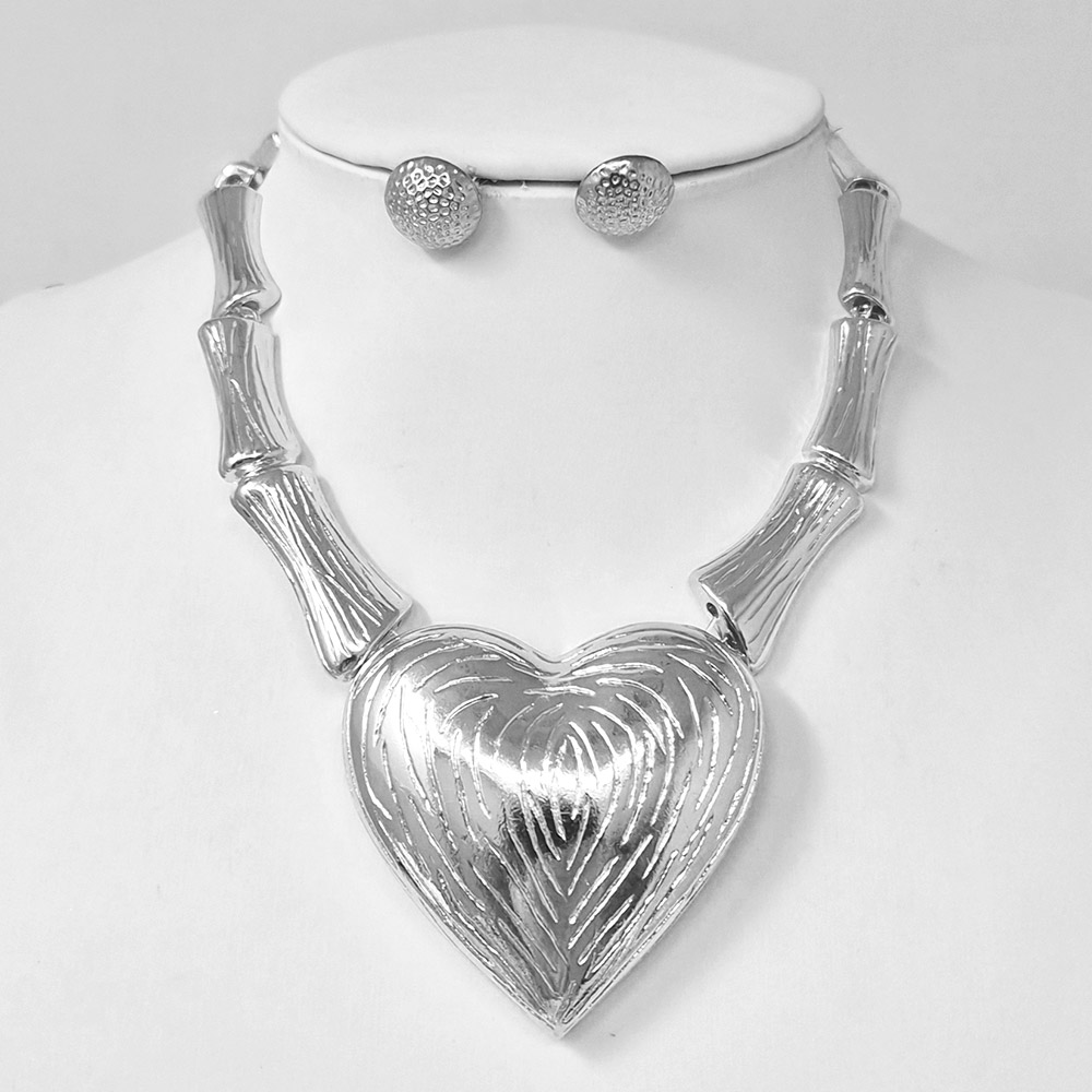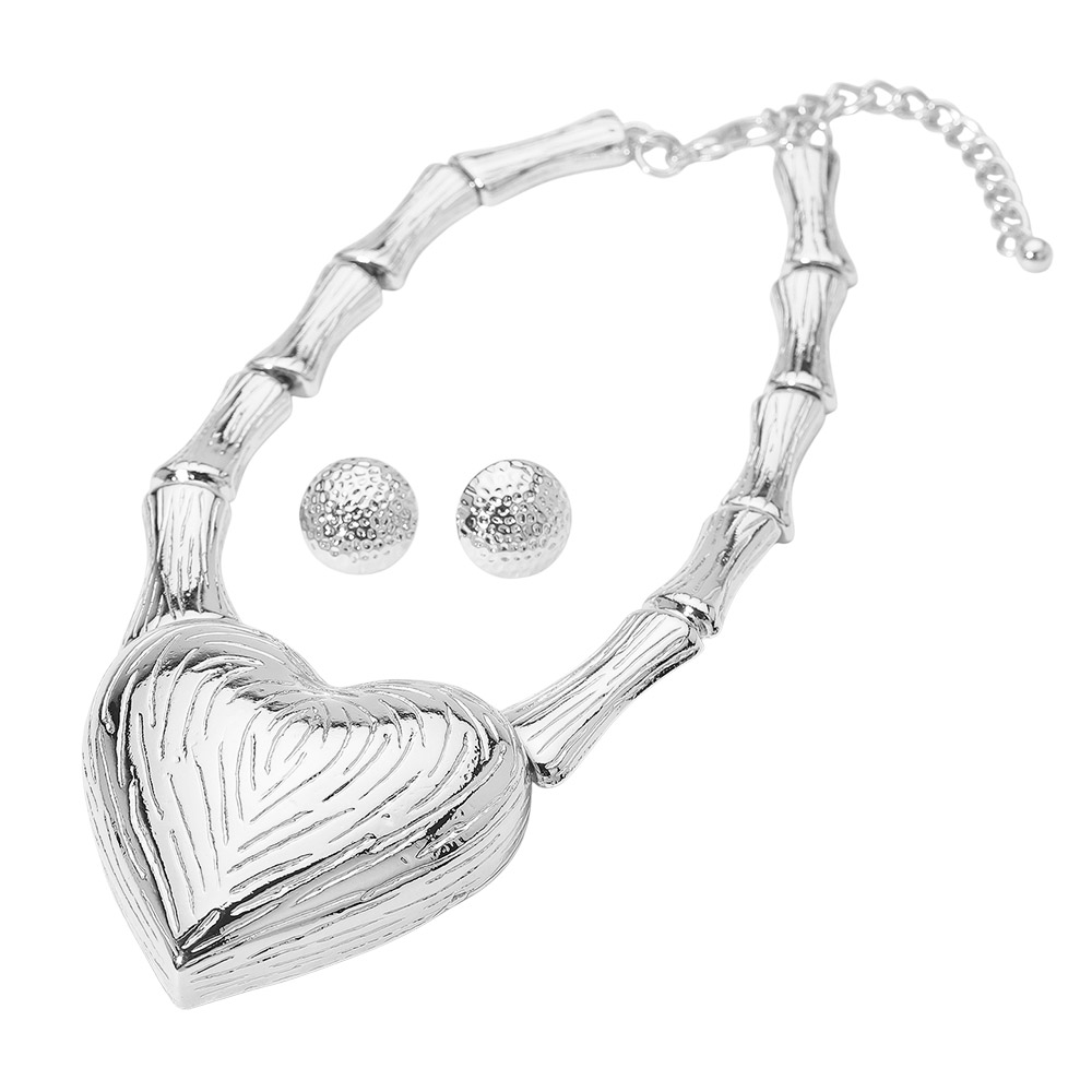 Bold Textured Metal Heart Accent Bamboo Link Statement Necklace
