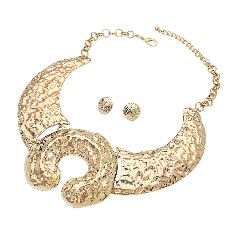 Details • Necklace Size : 19" + 3" L • Decor Size : 3" L • Earrings Size : 0.7" L • Command attention with this bold textured collar necklace and matching earrings. Featuring a sculpted crescent design with artistic detailing, this statement set adds modern sophistication and a touch of drama, perfect for evening wear or standout fashion moments. • Lead and Nickel Compliant