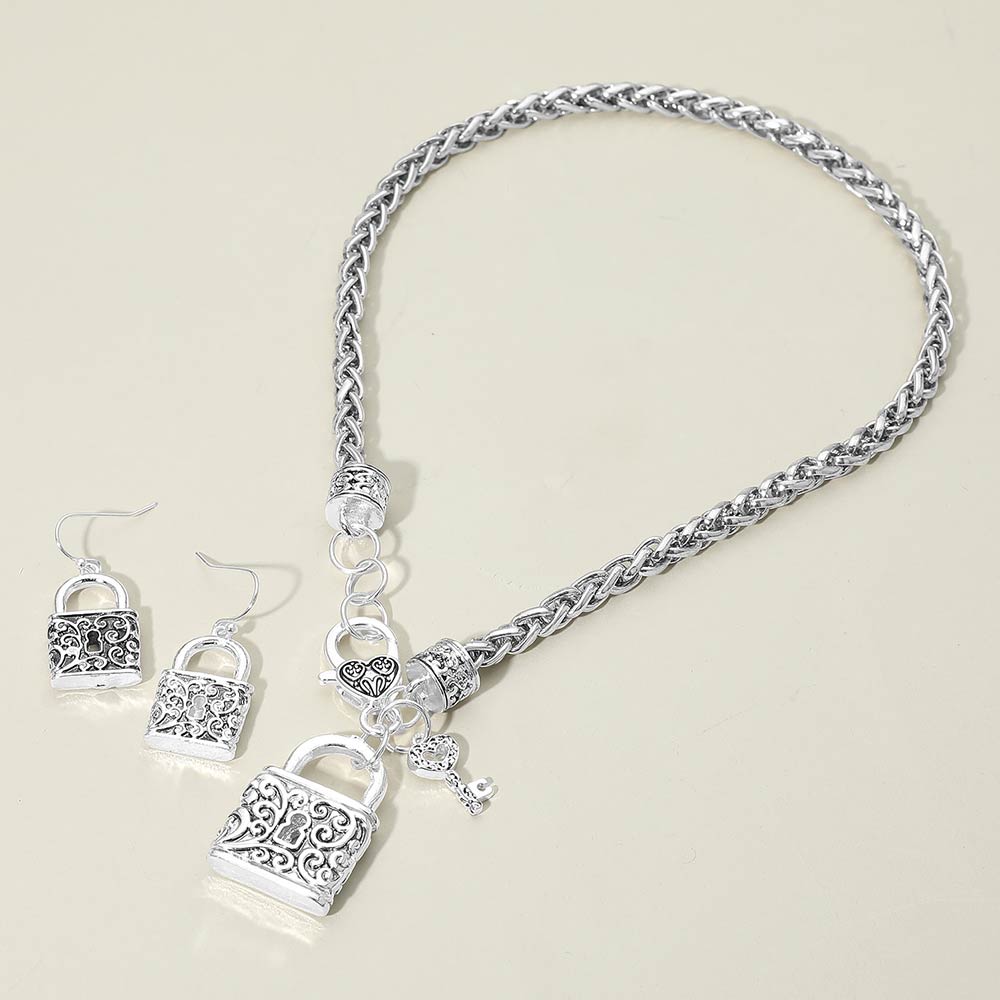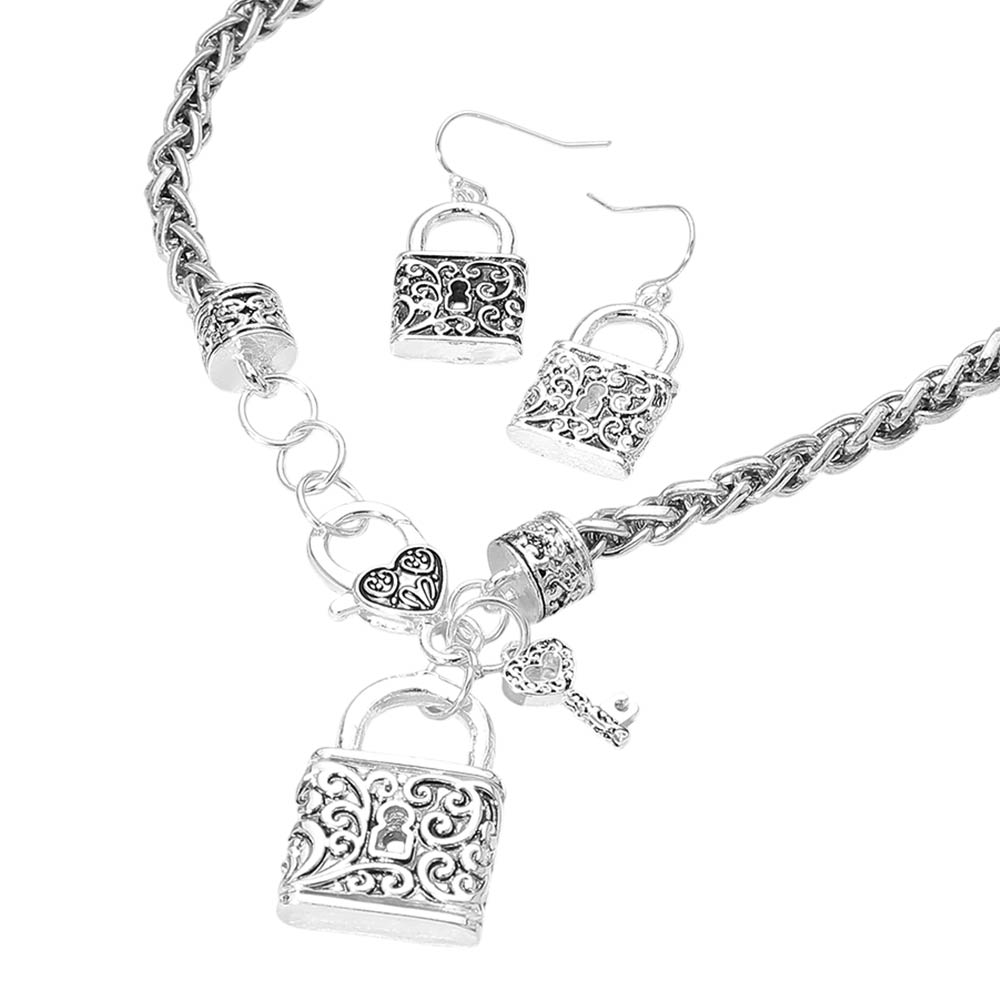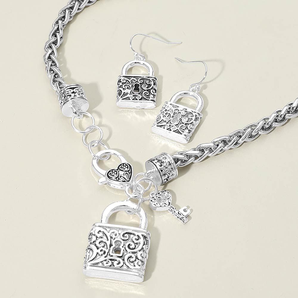 Details • Necklace Size : 18" + 1" L • Decor Size : 1.4" L • Earrings Size : 1.3" L • This lock and key charm jewelry set features an ornate padlock necklace paired with matching drop earrings for a coordinated look. Detailed scroll accents add vintage-inspired character while the charm design creates visual interest and movement. Ideal for boutiques seeking symbolic jewelry styles that appeal to gift shoppers, romance themes, and everyday statement wear. • Lead and Nickel Compliant