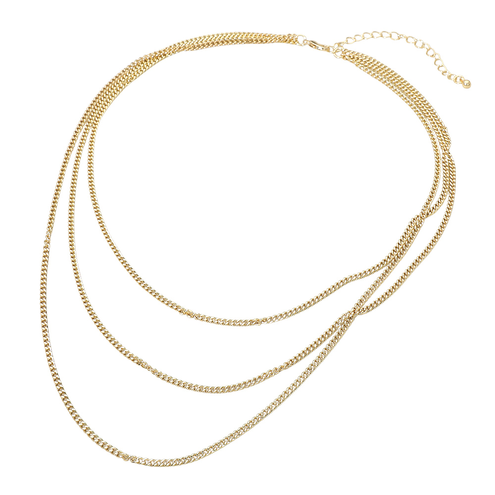 Details • Necklace Size : 18" + 3.25" L • Decor Size : 3" L • This triple layer link chain necklace delivers a bold yet refined layered look designed for easy styling. Its balanced drape creates dimension without effort, making it ideal for everyday wear or statement layering. A versatile essential for boutiques and wholesale collections seeking modern, trend-driven jewelry with lasting appeal. • Lead and Nickel Compliant • Gold Dipped