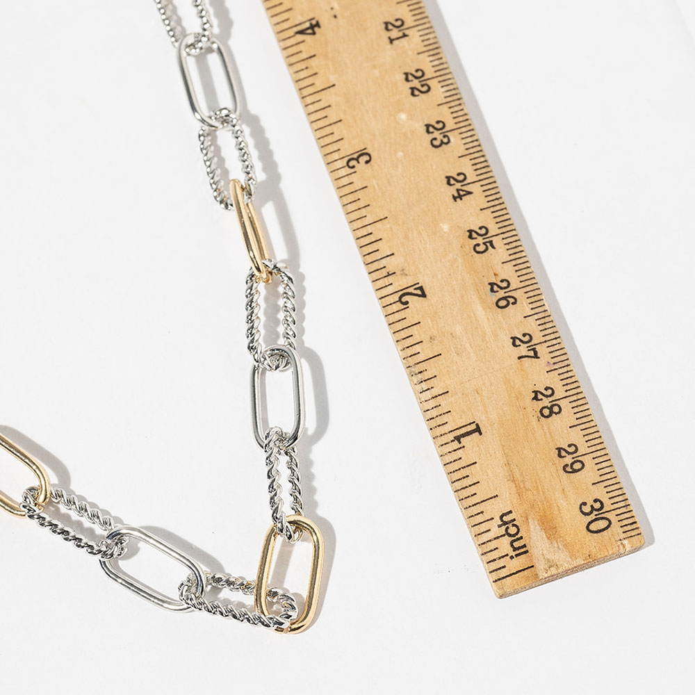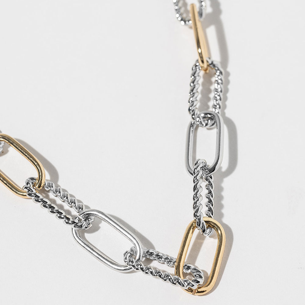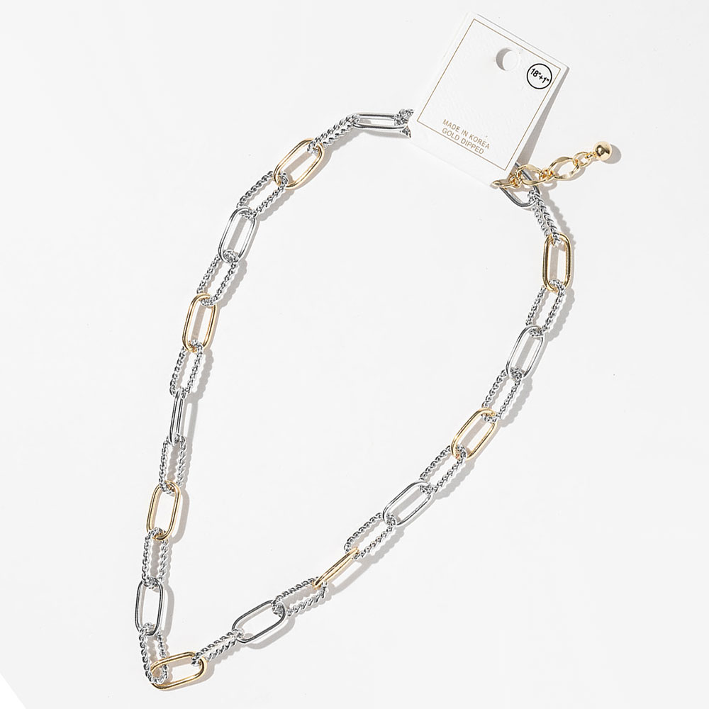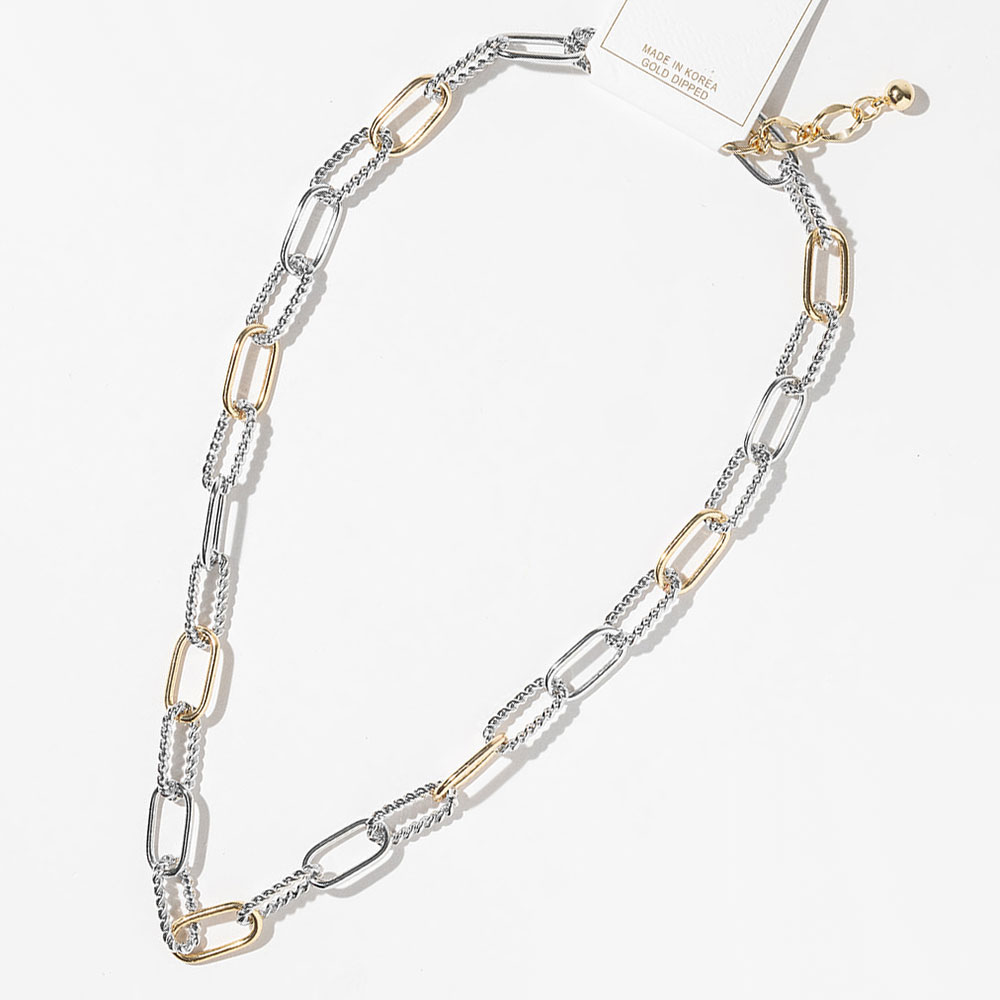 Details • Necklace Size : 18" + 1" L • Decor Size : 0.4" L • Mixed link chain necklace featuring an alternating link design that blends modern structure with effortless elegance. Designed for versatile styling, this necklace layers beautifully or stands alone as a statement piece, making it ideal for boutiques seeking trend-forward jewelry with everyday wearability and clean, timeless appeal. • Gold Dipped • Lead and Nickel Compliant • Made In Korea