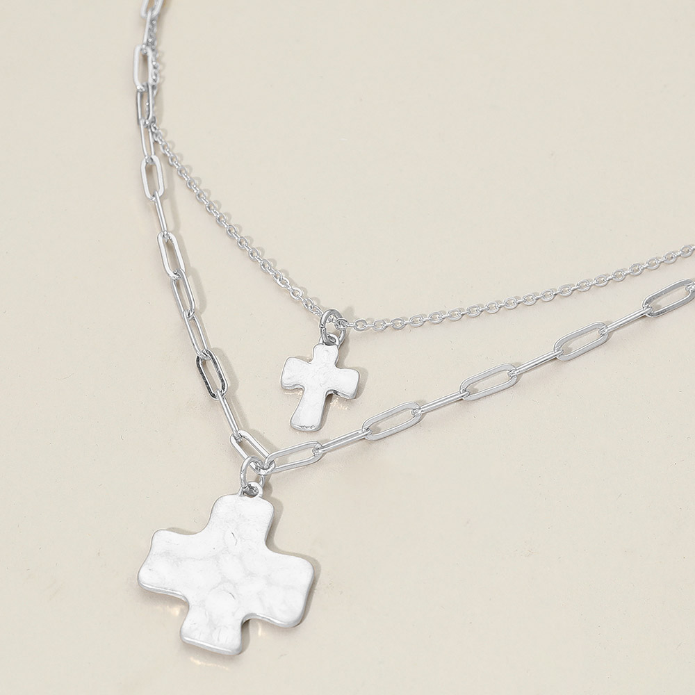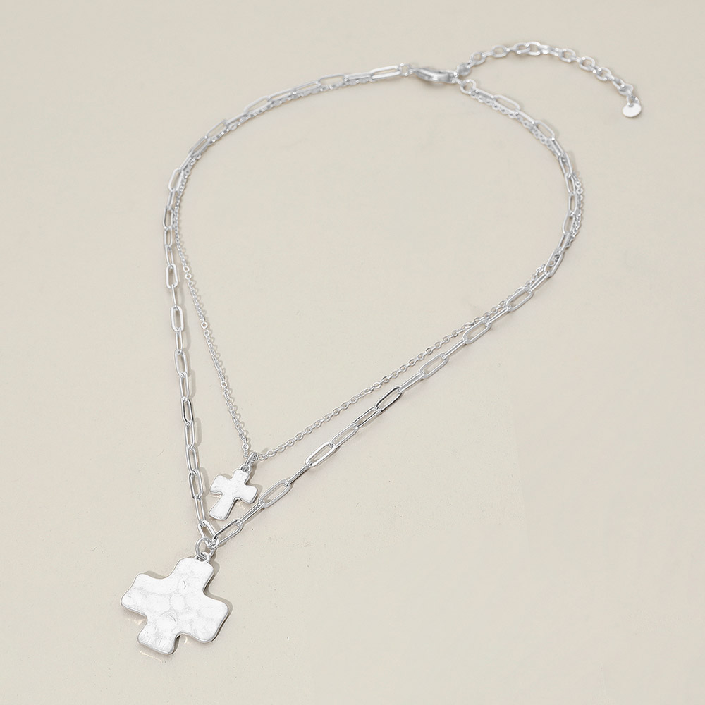 Hammered Metal Cross Pendant Accent Double Layered Necklace