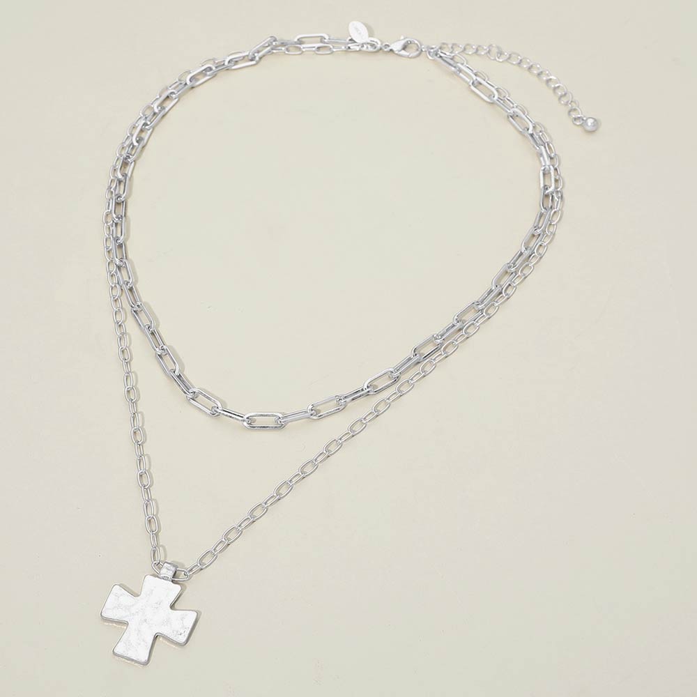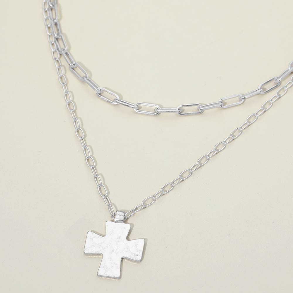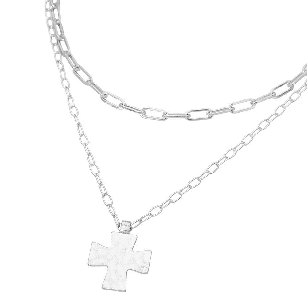 Hammered Metal Cross Pendant Double Layered Necklace