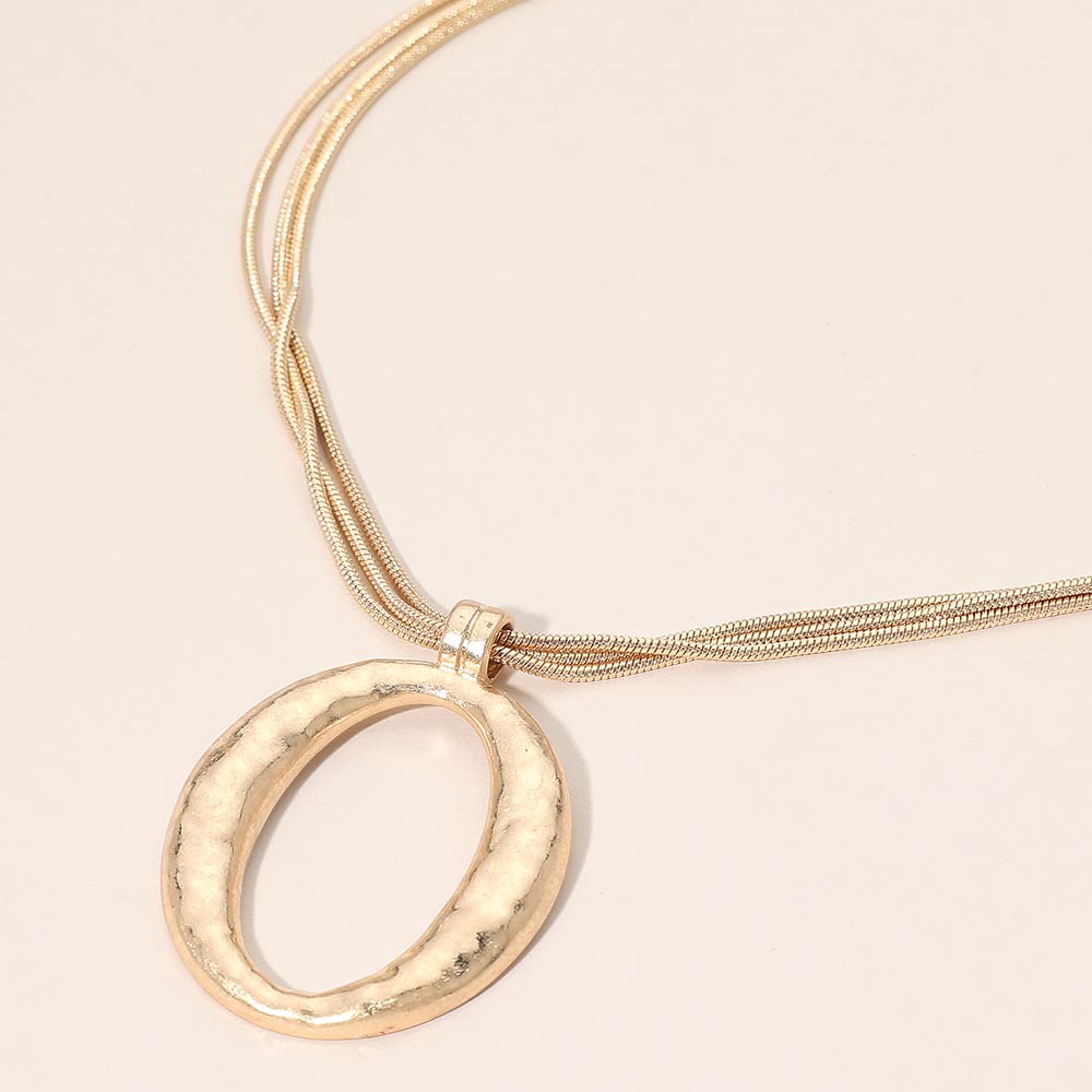 Details • Necklace Size : 17.5" + 3" L • Pendant Size : 1.25" X 1.75" • This layered oval pendant necklace features a softly textured open oval charm paired with a sleek multi-strand chain for a balanced, modern look. The minimalist silhouette adds subtle dimension and movement, making it easy to style alone or layered with other pieces. A versatile necklace option for boutiques seeking everyday jewelry that transitions effortlessly from casual outfits to polished, elevated styling. • Lead and Nickel Compliant