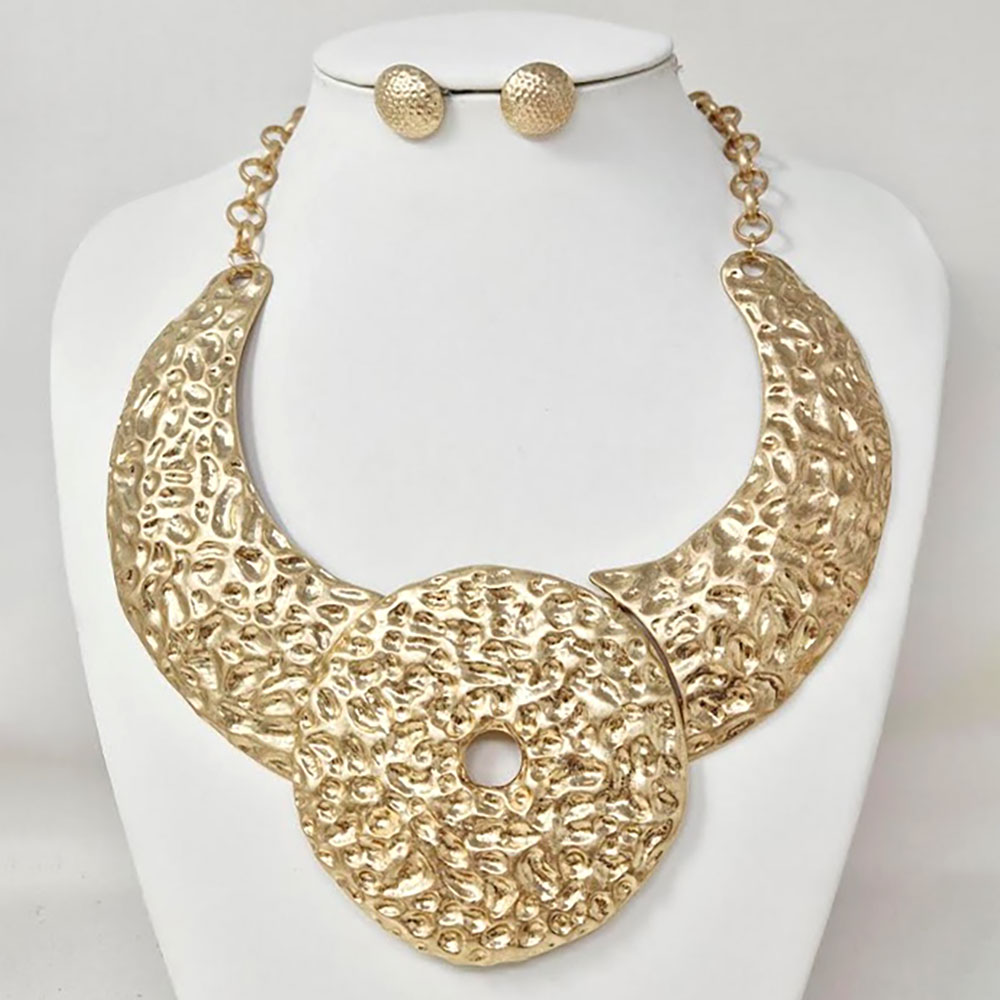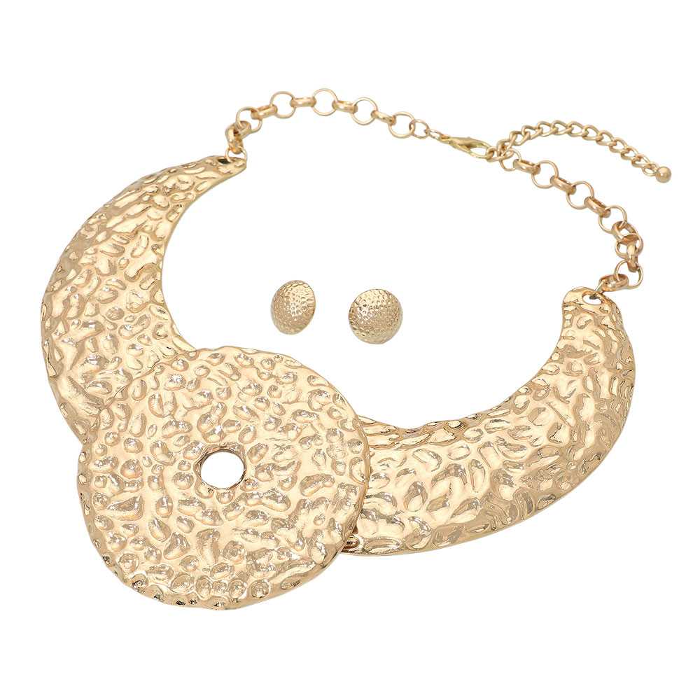 Details • Necklace Size : 19" + 3" L • Decor Size : 3.5" L • Earrings Size : 0.7" L • Elevate your look with this hammered statement collar necklace and matching earrings. Featuring bold, sculpted textures and a striking circular centerpiece, this set exudes modern elegance—perfect for adding a touch of artistic sophistication to any outfit. • Lead and Nickel Compliant