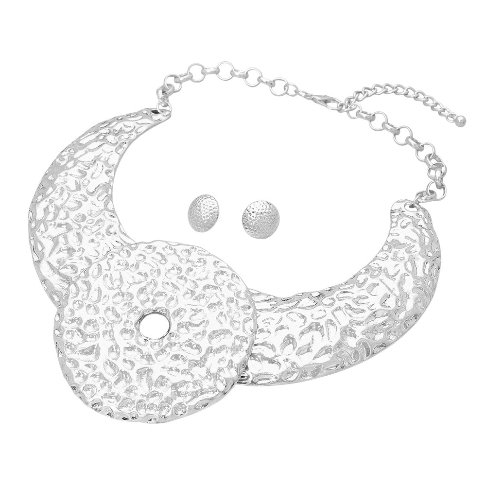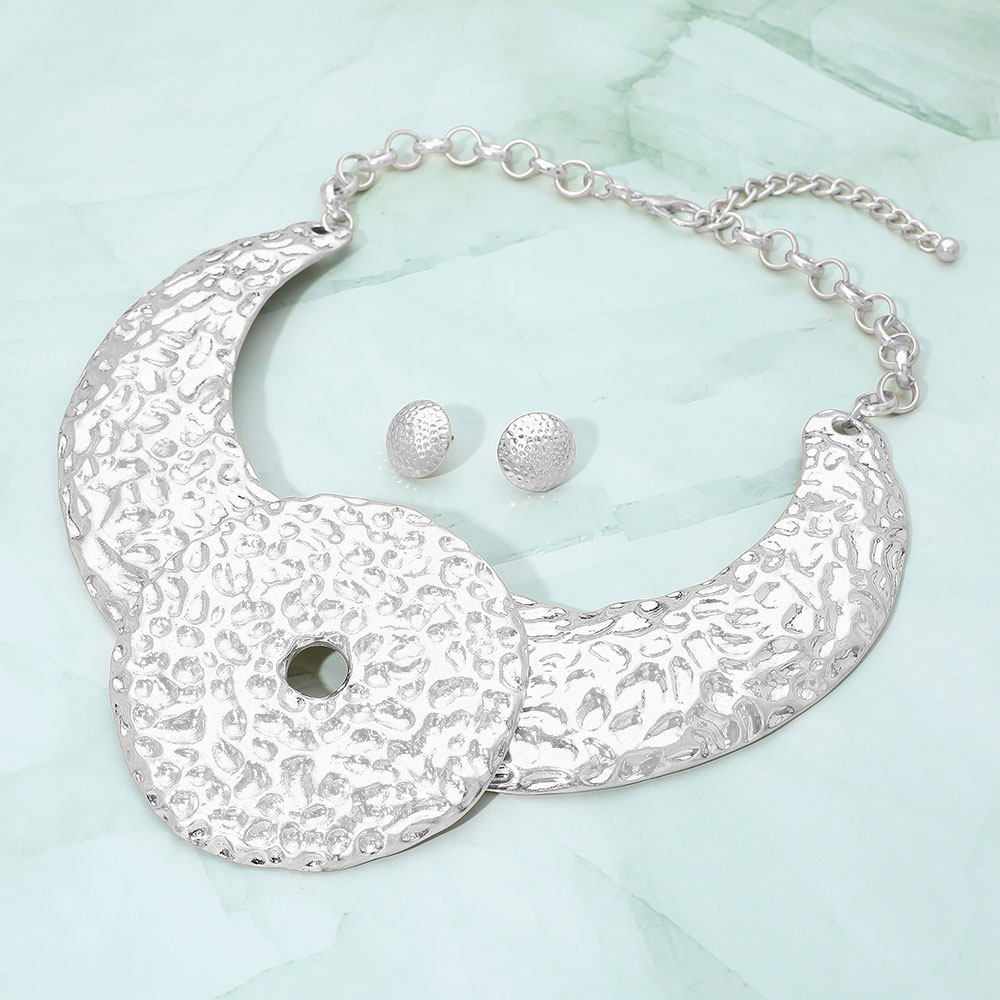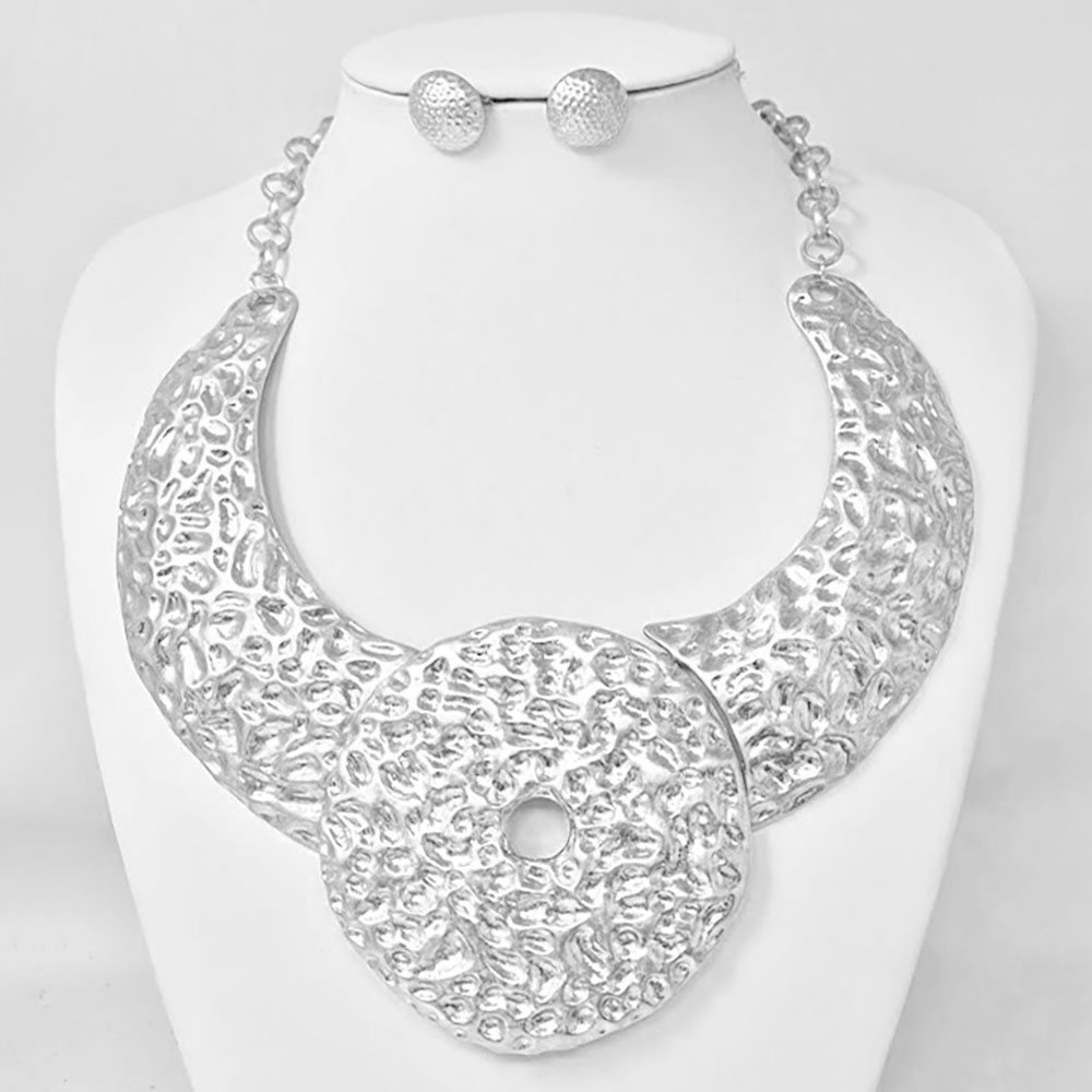 • Elevate your look with this hammered statement collar necklace and matching earrings. Featuring bold, sculpted textures and a striking circular centerpiece, this set exudes modern elegance—perfect for adding a touch of artistic sophistication to any outfit.