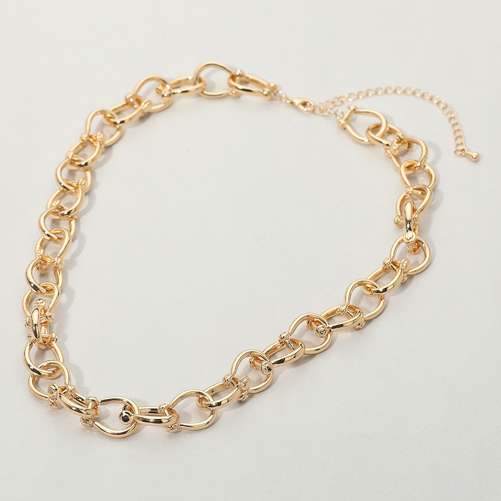 Details • Necklace Size : 16" + 3.5" L • Decor Size : 0.5" L • Make a bold yet refined impression with this elegant interlocking chain necklace. Its intricate looped design adds sophistication to any outfit, making it the perfect accessory for both casual and formal looks. Ideal for layering or wearing solo as a timeless statement piece. • Lead and Nickel Compliant