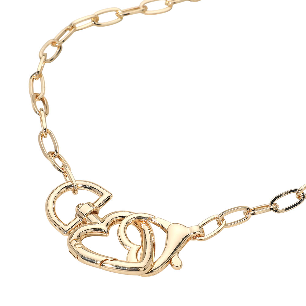 Details • Necklace Size : 17" + 1.75" L • Decor Size : 1" L • This heart link chain necklace features an elegant chain design accented by a sculptural heart-inspired clasp that doubles as a focal detail. Designed to blend modern edge with romantic appeal, it offers versatile styling for everyday wear or layered looks, making it a strong statement piece for contemporary jewelry collections. • Lead and Nickel Compliant