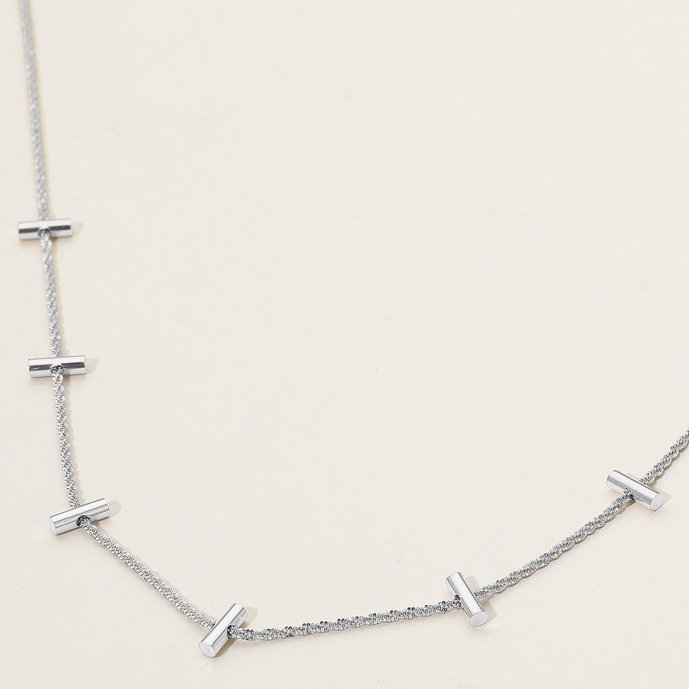 Details • Necklace Size : 16" + 2" L • Decor Size : 0.4" L • Water Resistant • Add subtle sophistication to your look with this modern tube bar necklace, featuring a sleek arrangement of small cylindrical accents on a refined chain. Perfect for both everyday wear and elegant occasions, this versatile piece complements any minimalist jewelry collection. • Hypoallergenic • Stainless Steel