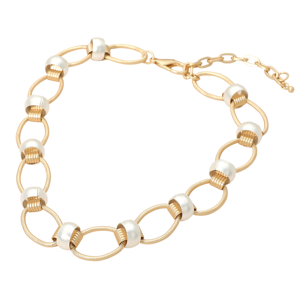 Details • Necklace Size : 16.5" + 3.25" L • Decor Size : 0.75" L • This modern mixed link statement necklace features smooth oval links accented with contrasting bead details for a refined yet bold look. Designed to sit comfortably at the neckline, it adds dimension and visual interest without overpowering an outfit. An adjustable extender provides flexible wear, making it ideal for everyday styling, office looks, or elevated casual outfits. Perfect as a standalone piece or layered with other necklaces. • Lead and Nickel Compliant