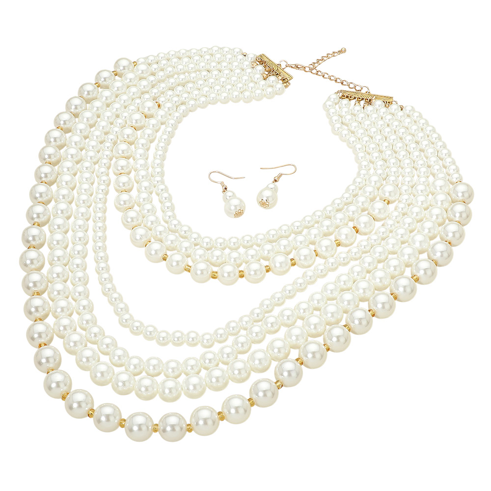 Details • Necklace Size : 16" + 3" L • Decor Size : 7.25" L • Earrings Size : 1.3" L • This multi strand pearl necklace set features layered strands with a graceful drape and coordinating drop earrings for a complete look. Designed to elevate formal outfits, special occasions, weddings, and elegant events. A timeless jewelry set that adds dimension and polish, ideal for boutiques, gift assortments, and statement accessory collections. • Lead and Nickel Compliant