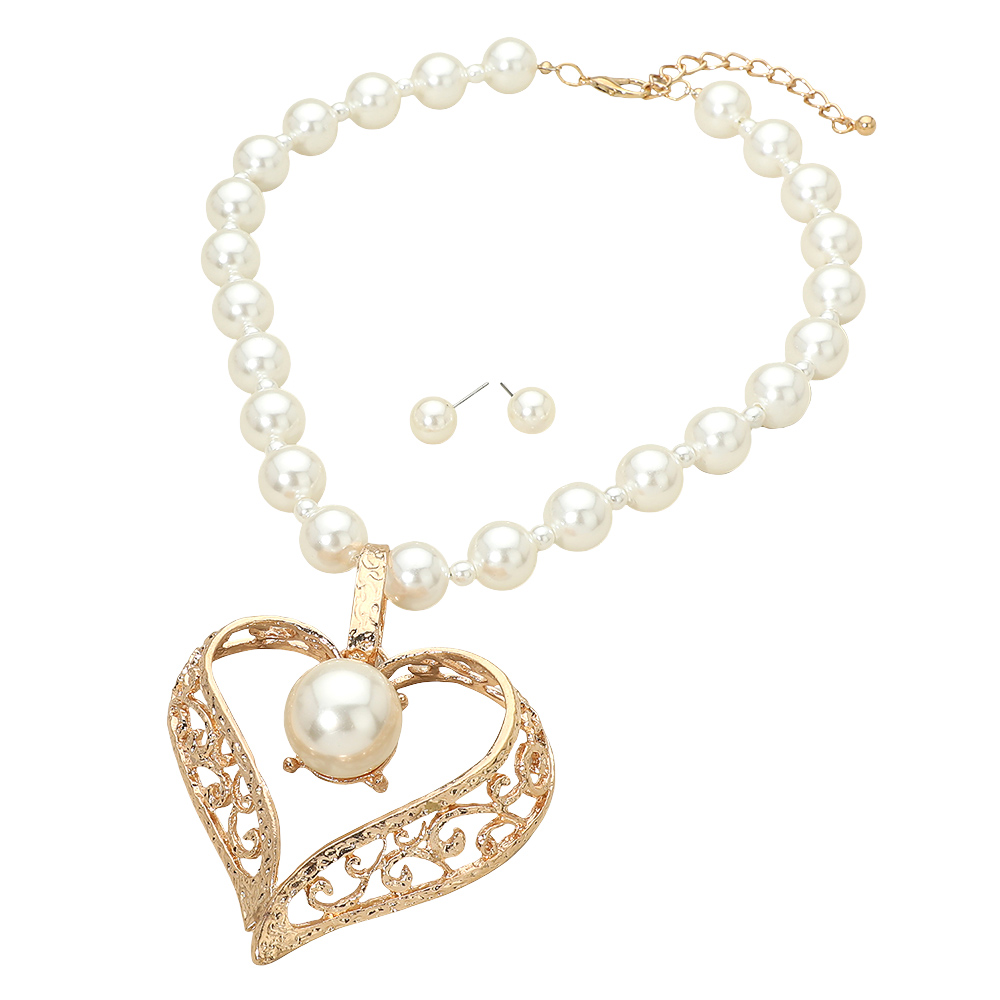 Details • Necklace Size : 20.5" + 3.25" L • Decor Size : 0.6" L • Pendant Size : 3.8" X 4" • Earrings Size : 0.3" L • This pearl necklace set features a classic beaded design highlighted by a heart shaped pendant centerpiece and coordinating stud earrings. Designed for weddings, special occasions, and elegant everyday styling, it adds timeless charm and graceful detail. A versatile jewelry set ideal for boutiques, gifting, and refined accessory collections seeking romantic appeal and polished presentation. • Lead and Nickel Compliant