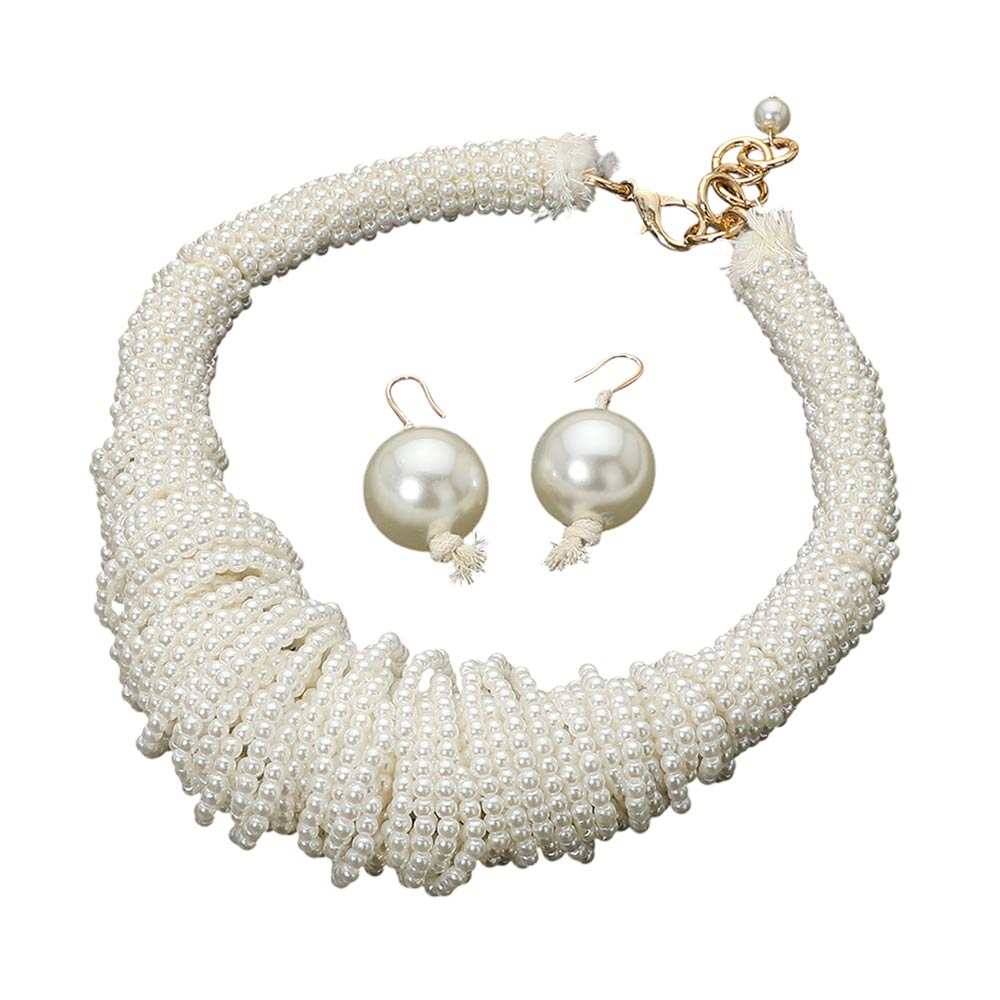 Details • Necklace Size : 18" + 3.5" L • Decor Size : 1.7" L • Earrings Size : 2.1" L • Striking statement necklace set designed with layered wrapped pearl detailing for dramatic texture and movement. Sits comfortably at the neckline and includes matching drop earrings for a cohesive look. Ideal for special occasions, evening wear, or boutiques seeking bold, fashion-forward pearl jewelry sets. • Lead and Nickel Compliant