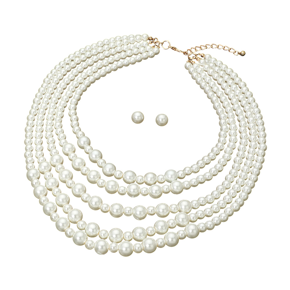 Details • Necklace Size : 19" + 3" L • Decor Size : 5" L • Earrings Size : 0.4" L • Elegant multi strand beaded necklace set designed for timeless styling and effortless layering. Features graduated strands with matching stud accents and an adjustable closure for versatile wear. Ideal for weddings, formal events, office looks, or elevating everyday outfits with a refined, classic statement. • Lead and Nickel Compliant