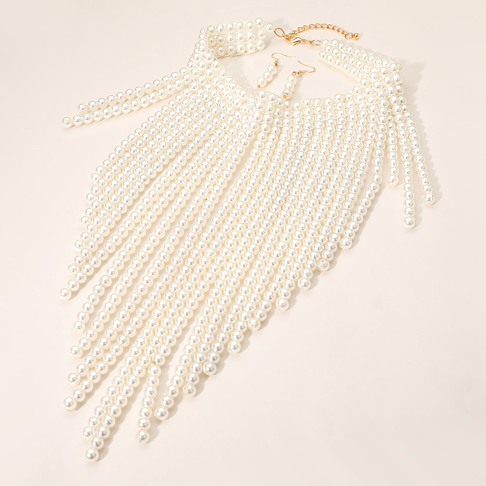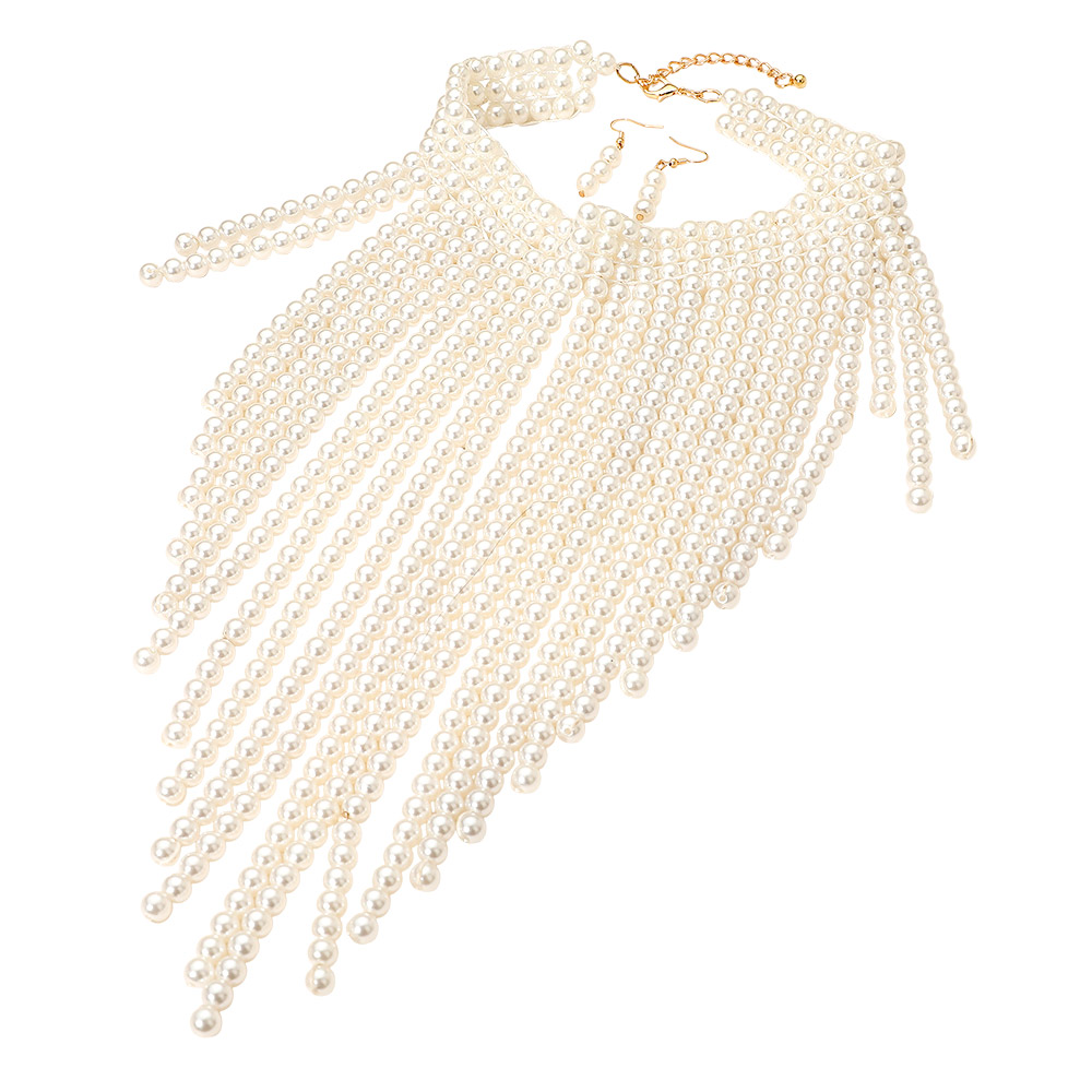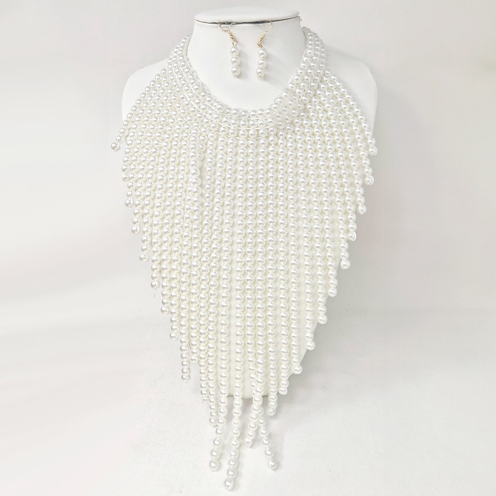 • This layered pearl-inspired necklace set showcases cascading strands that create a dramatic fringe effect for a show-stopping look. Paired with matching dangling earrings, it’s perfect for glamorous occasions, formal events, or adding elegance to evening wear.