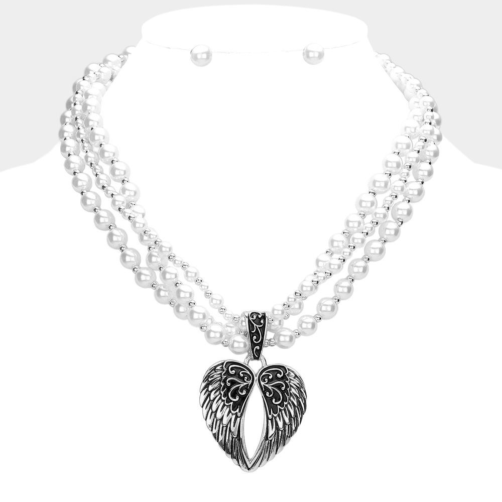 Details • Necklace Size : 18" + 3" L • Pendant Size : 1.6" X 2.3" • Earring Size : 0.3" L • Elevate your style with a layered pearl bead necklace featuring an angel wing heart pendant, symbolizing love and protection. Perfect for daily wear or special occasions. • Lead and Nickel Compliant