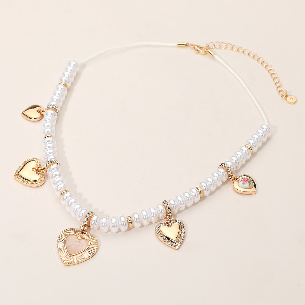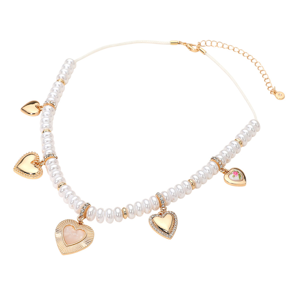 Multi Heart Charm Station Pearl Beaded Necklace