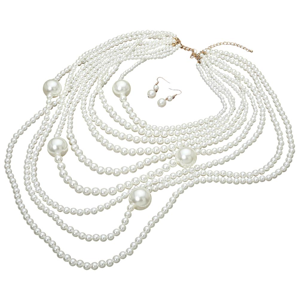 Details • Necklace Size : 20" + 5" L • Decor Size : 12.5" L • Earrings Size : 1.75" L • Elegant multi strand pearl necklace set designed with layered draping and statement bead accents for added dimension and movement. Creates a bold yet timeless look and includes matching drop earrings for coordinated styling. Ideal for formal events, bridal wear, or boutiques seeking classic, elevated jewelry sets. • Lead and Nickel Compliant