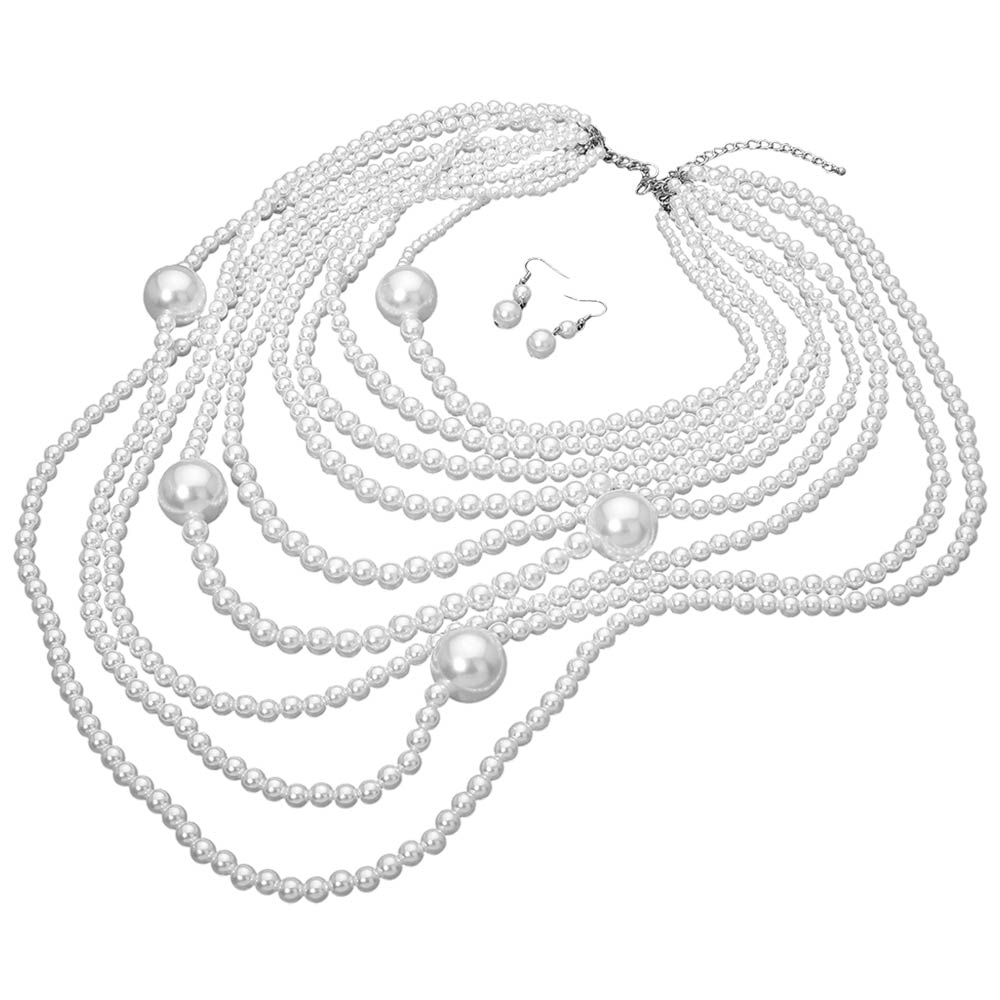 • Elegant multi strand pearl necklace set designed with layered draping and statement bead accents for added dimension and movement. Creates a bold yet timeless look and includes matching drop earrings for coordinated styling. Ideal for formal events, bridal wear, or boutiques seeking classic, elevated jewelry sets.
