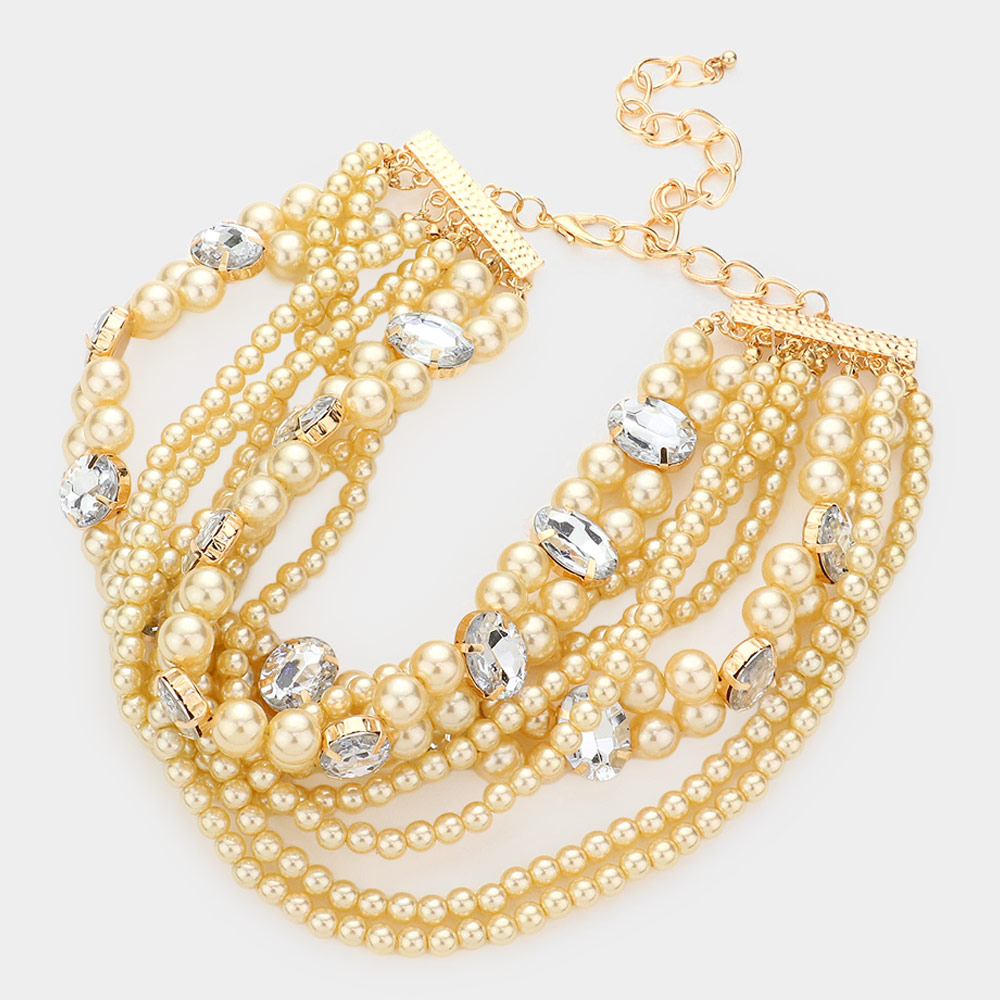 Details • Necklace Size : 13.5" + 5" L • Decor Size : 2.25" L • Earring Size : 2.25" L • Bold layered pearl necklace and earring set featuring multiple strands with shimmering accent stones for an elegant statement look. Perfect for formal events, evening wear, or adding glamorous flair to any special occasion outfit. • Lead and Nickel Compliant