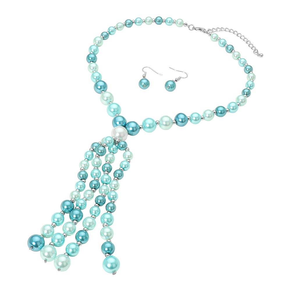 • Elegant bead necklace and earring set featuring graduated pearl-style beads and a cascading tassel centerpiece for a refined, statement look. Perfect for dressing up special occasions or adding a polished touch to everyday outfits. A coordinated set that offers timeless charm and sophisticated style.