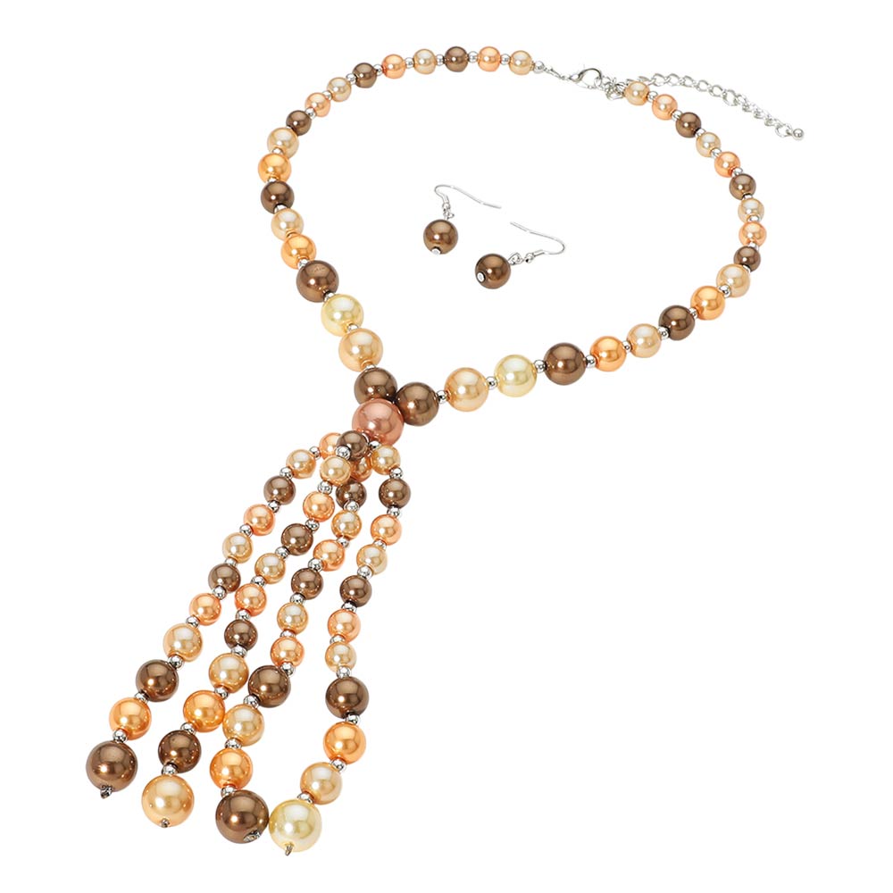 • Elegant bead necklace and earring set featuring graduated pearl-style beads and a cascading tassel centerpiece for a refined, statement look. Perfect for dressing up special occasions or adding a polished touch to everyday outfits. A coordinated set that offers timeless charm and sophisticated style.