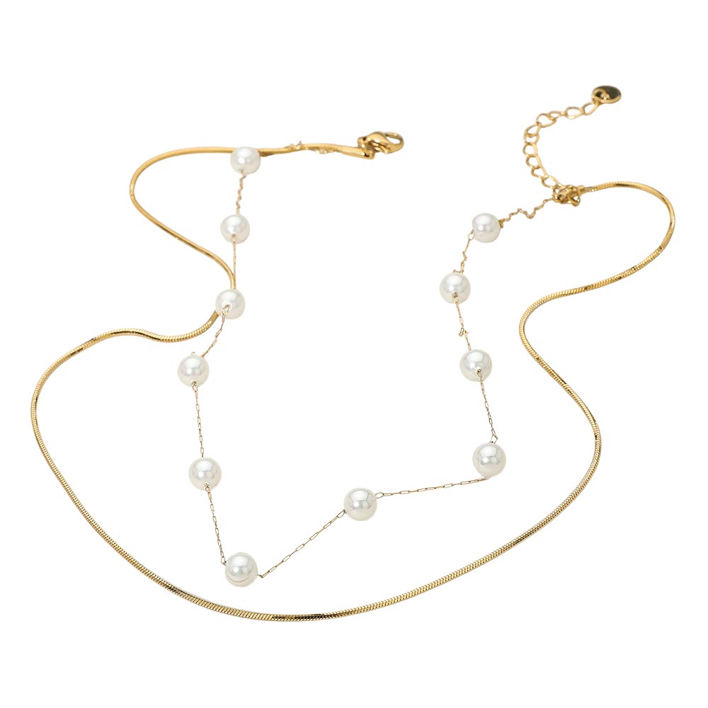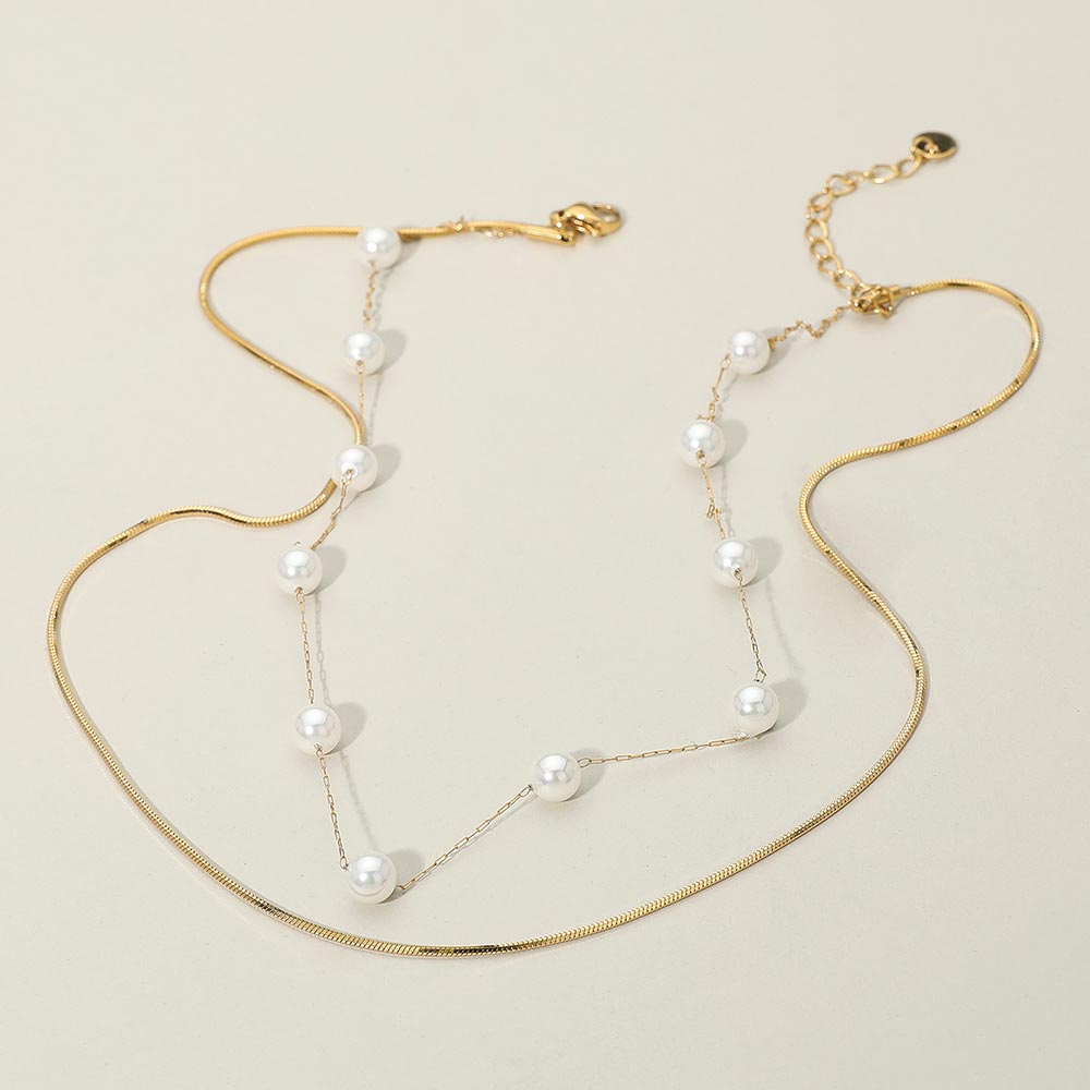 • A refined two-layer necklace featuring a smooth chain paired with a dainty strand accented by spaced pearl-style beads. Its lightweight, feminine design makes it perfect for daily wear, layering, or gifting, adding a touch of timeless elegance to any outfit.