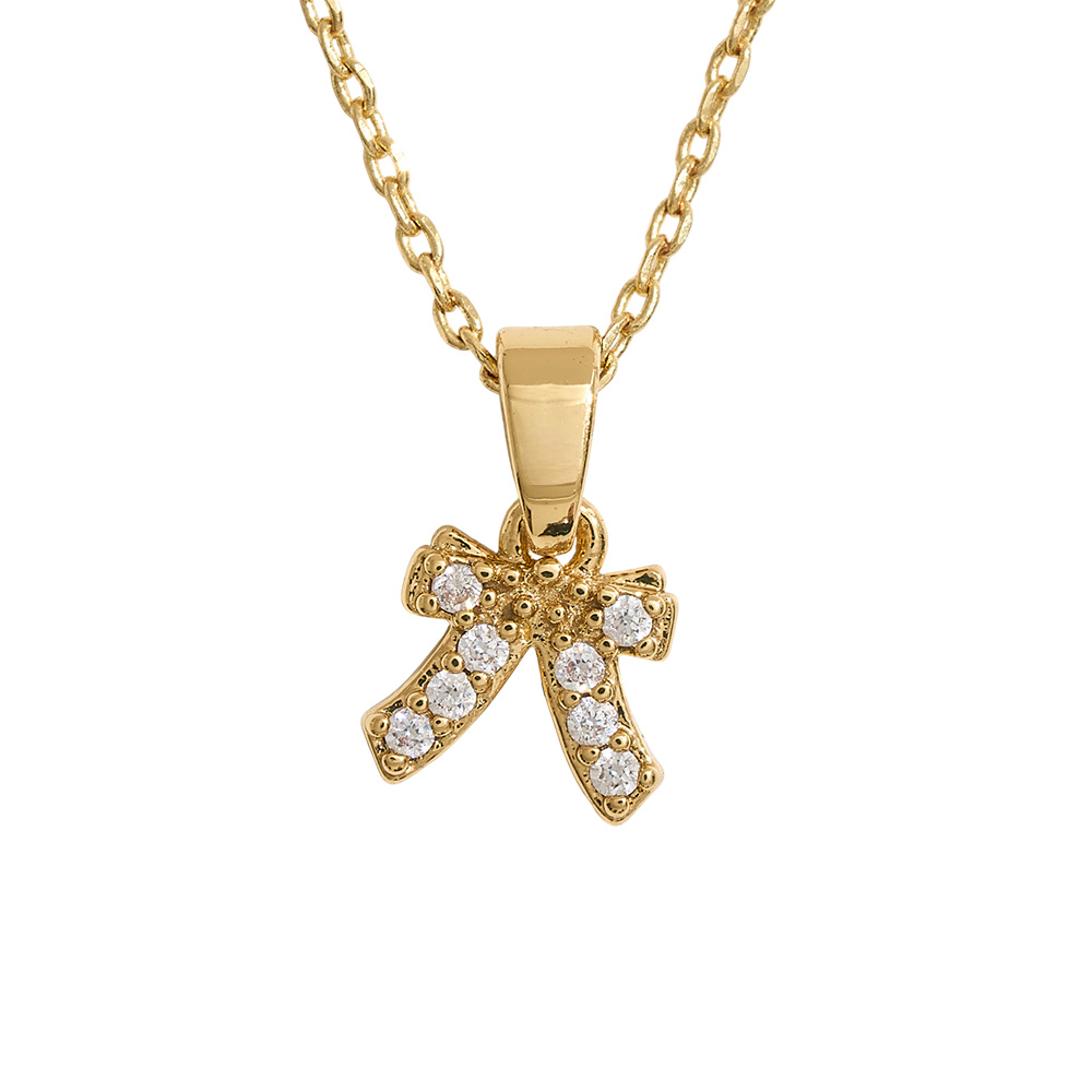 Details • Necklace Size : 16" + 2" L • Pendant Size : 0.3" X 0.6" • A delicate bow-shaped pendant adorned with sparkling CZ stones, this necklace adds a feminine and graceful charm to any outfit. Perfect for layering or wearing solo, it makes a versatile accessory for daily wear and a thoughtful gift for someone special. • CZ Cubic Zirconia • Gold Dipped • Made In Korea