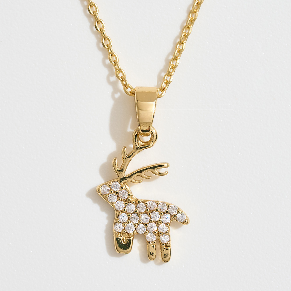 Details • Necklace Size : 16" + 2" L • Pendant Size : 0.4" X 0.7" • Charming and festive, this reindeer pendant necklace sparkles with CZ accents that capture the magic of the season. A playful yet elegant accessory, it adds a joyful touch to your look and makes a delightful gift for holiday celebrations or year-round style. • CZ Cubic Zirconia • Gold Dipped • Made In Korea