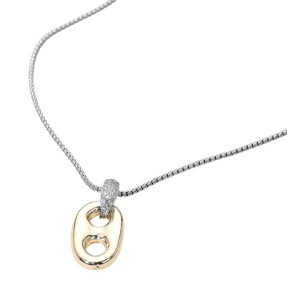 Details • Necklace Size : 16.5" + 2.25" L • Pendant Size : 0.6" X 1.3" • Elevate your accessories with this sleek two-tone necklace featuring a sculpted modern mariner link pendant accented with subtle sparkle. Its contemporary design adds refined character to any outfit, making it a versatile piece that blends artistic flair with everyday sophistication. • CZ Cubic Zirconia • Gold Dipped