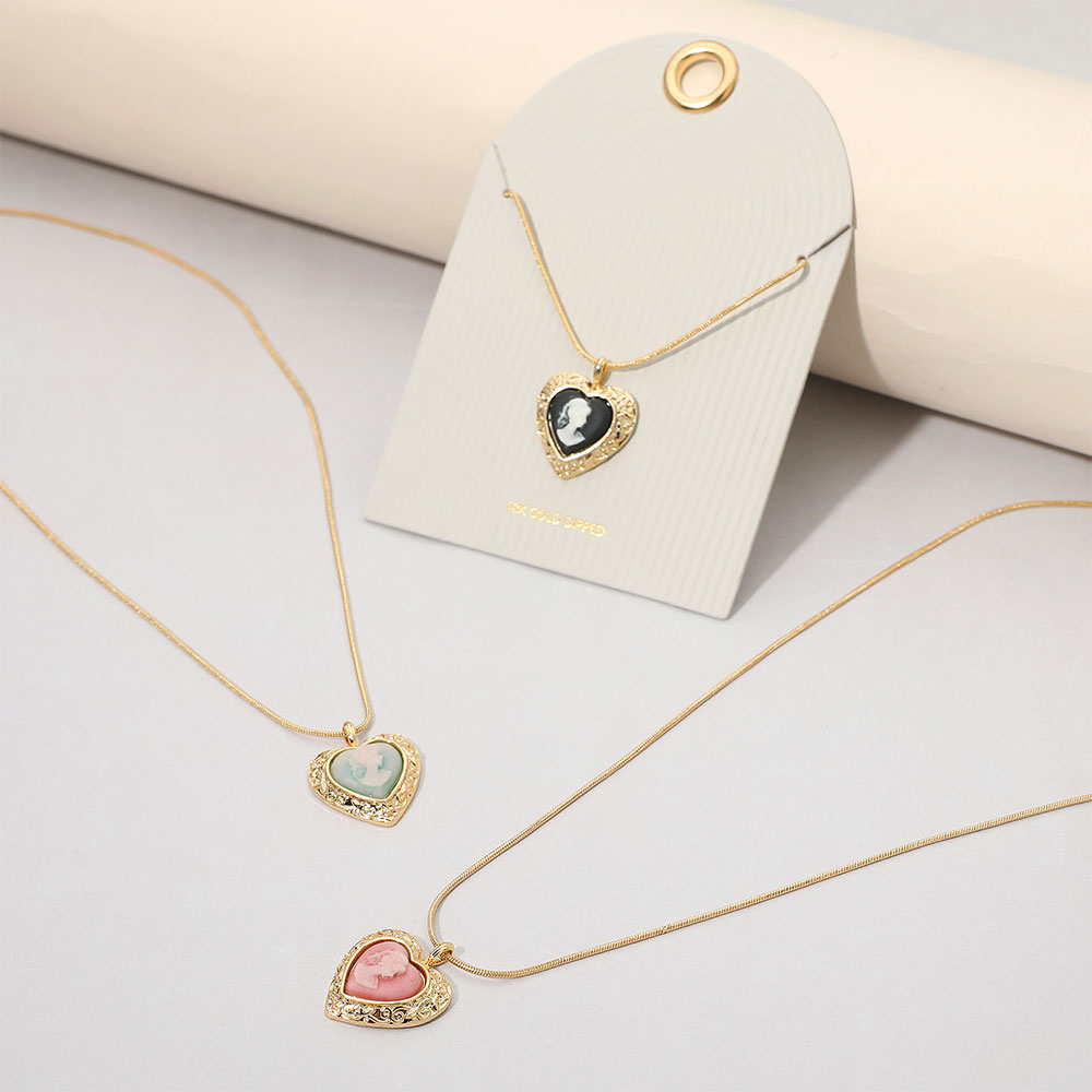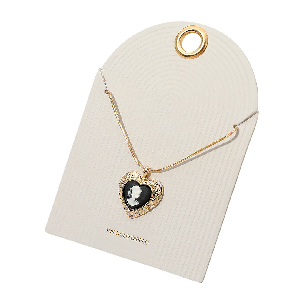 Details • Necklace Size : 16" + 3" L • Pendant Size : 0.75" X 0.9" • Elegant heart-shaped cameo pendant necklace featuring a classic portrait design on a fine chain. A timeless statement piece ideal for layering or wearing solo, perfect for elevating everyday outfits, special occasions, and thoughtful gifting with a romantic vintage feel. • Gold Dipped • Lead and Nickel Compliant • Made In Korea