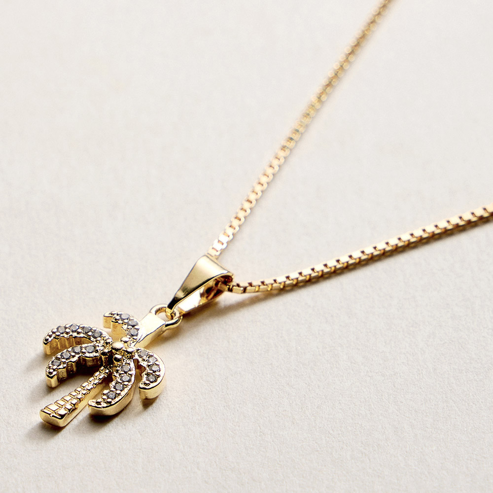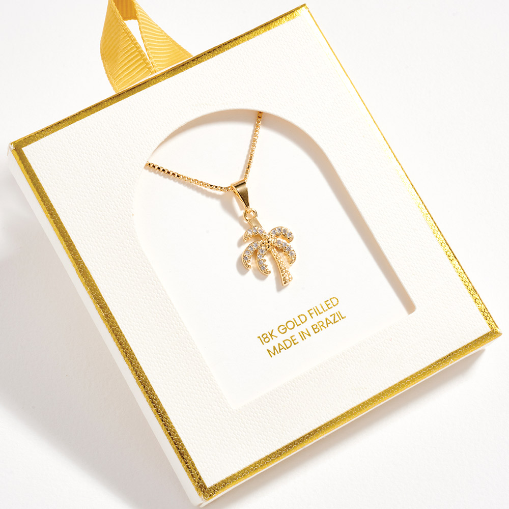 Details • Necklace Size : 18" + 1.75" L • Pendant Size : 0.5" X 1" • This palm tree pendant necklace features a sparkling charm design that adds a playful yet polished accent to everyday and vacation-inspired looks. Perfect for layering or wearing solo, it offers an easy way to elevate casual outfits, resort styles, or gift-ready jewelry selections with a trendy tropical touch. • CZ Cubic Zirconia • Gold Filled • Hypoallergenic • Lead and Nickel Compliant • Made In Brazil