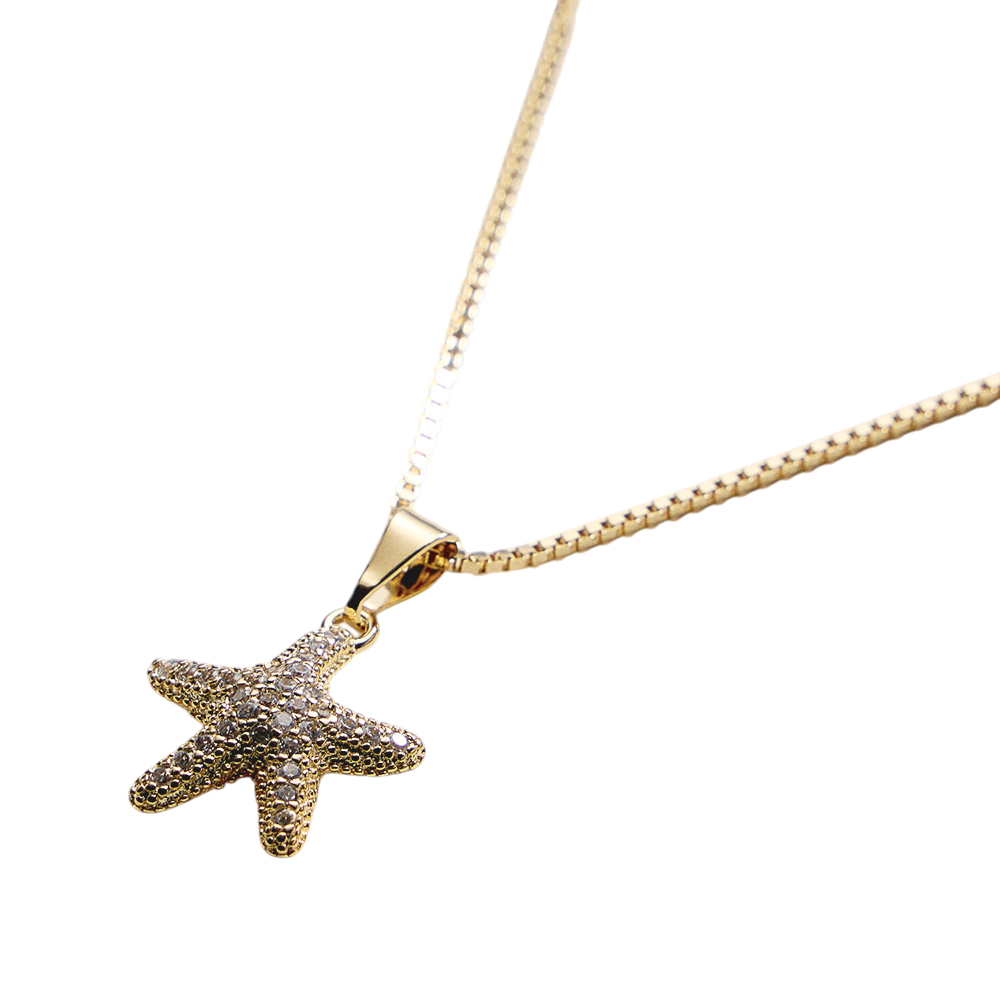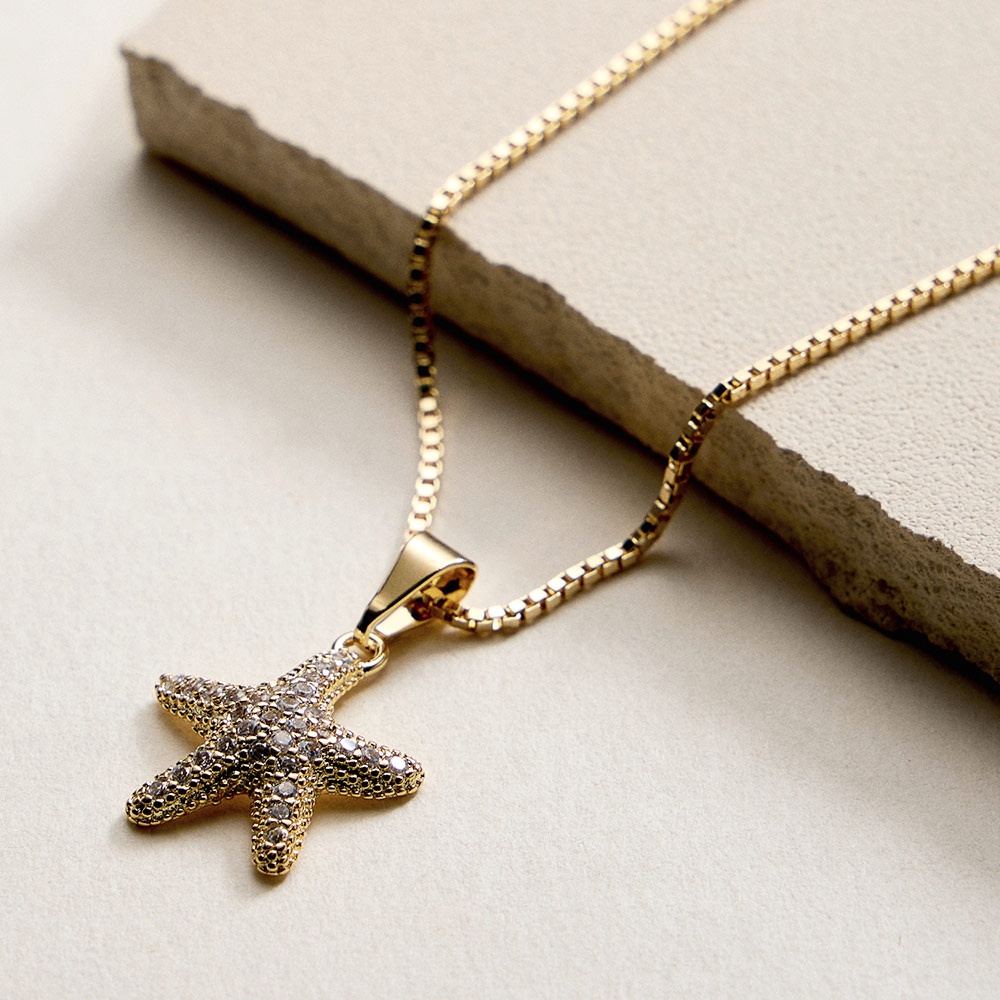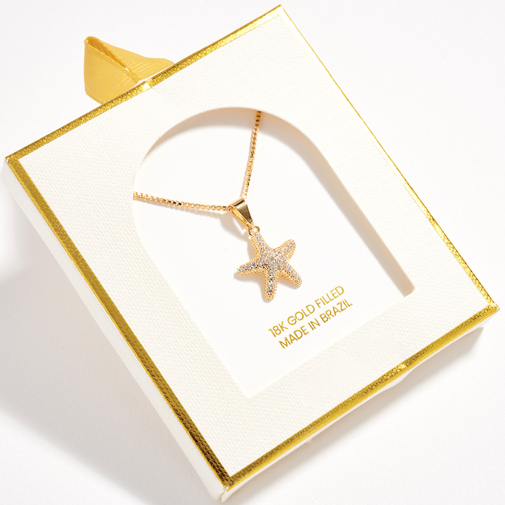 Details • Necklace Size : 18" + 1.75" L • Pendant Size : 0.7" X 1" • This starfish charm pendant necklace brings a breezy, coastal-inspired touch to everyday jewelry styling. Designed for effortless layering or standalone wear, it adds playful elegance to casual and resort looks. A great choice for boutiques and gift shops seeking ocean-themed, trend-friendly accessories. • CZ Cubic Zirconia • Gold Filled • Hypoallergenic • Lead and Nickel Compliant • Made In Brazil