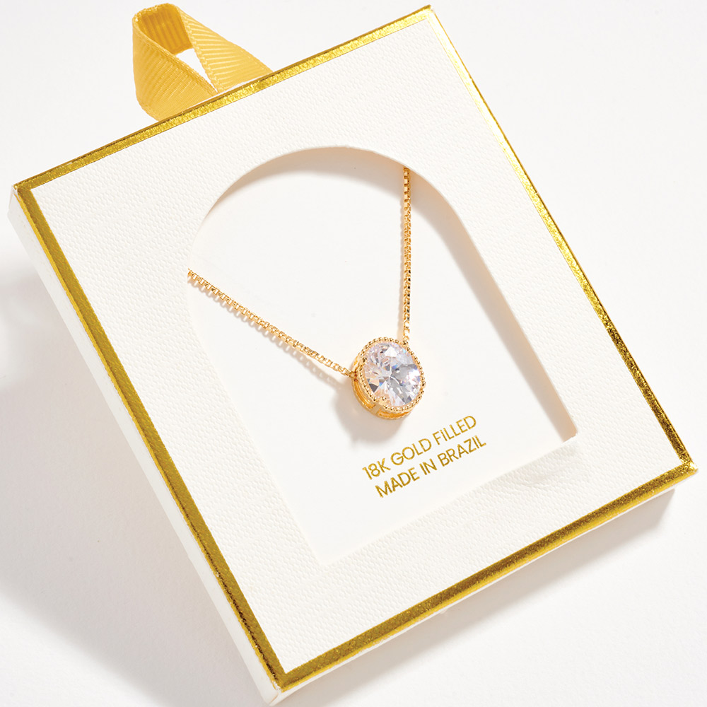 Details • Necklace Size : 18" + 1.75" L • Pendant Size : 0.4" X 0.5" • This oval solitaire pendant necklace features a clean, timeless silhouette designed for effortless everyday wear. Its classic shape makes it easy to style alone or layer with other necklaces, appealing to customers seeking simple elegance. A versatile jewelry essential ideal for boutiques, gifting displays, and modern accessory collections. • Lead and Nickel Compliant • Hypoallergenic • Gold Filled • CZ Cubic Zirconia • Made In Brazil