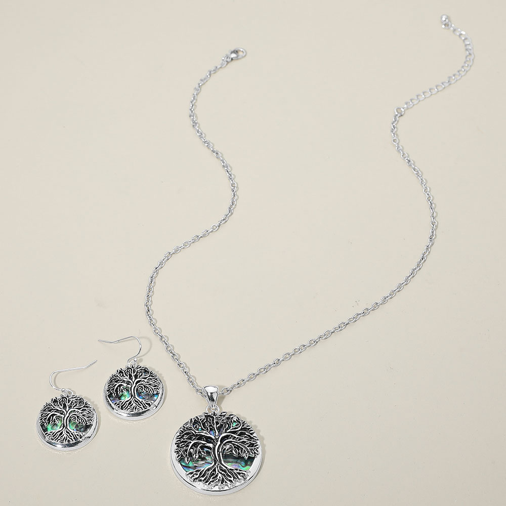 • Elegant Tree of Life jewelry set featuring a detailed pendant necklace with matching dangle earrings. The intricate branching design adds symbolic meaning and timeless style. Lightweight and versatile, perfect for everyday wear, gifting, or adding a meaningful touch to any outfit.