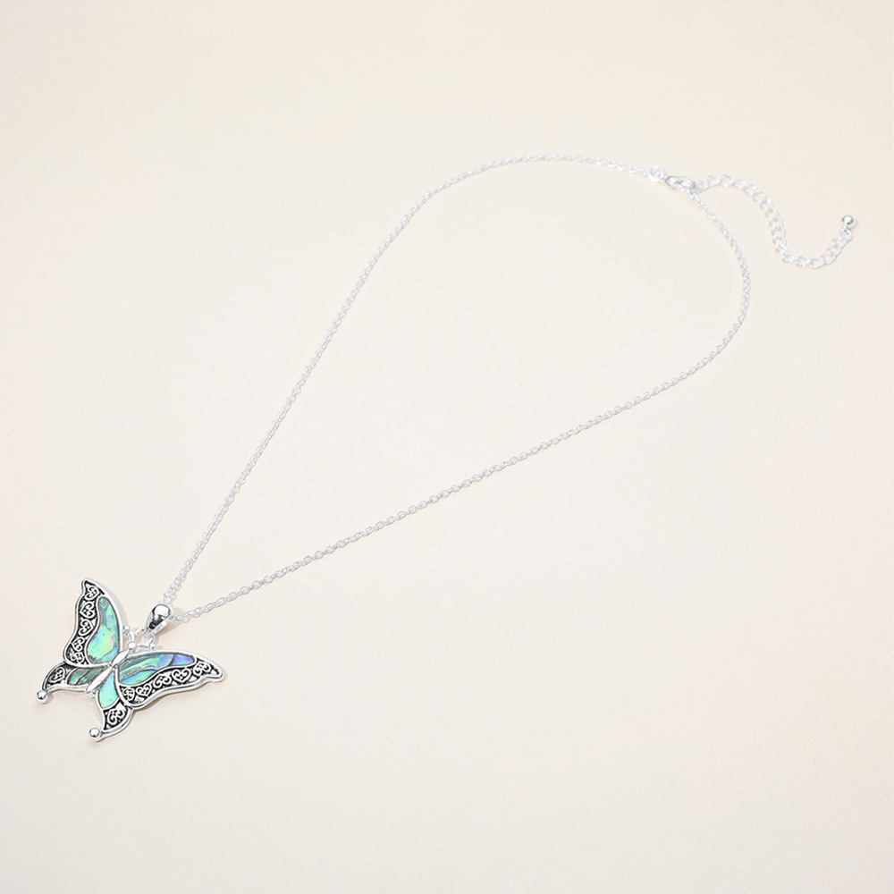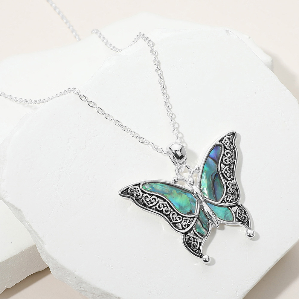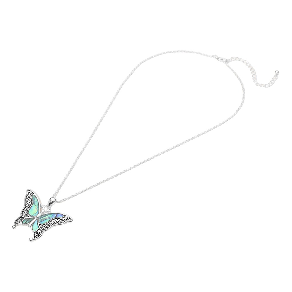 Antique Metal Abalone Pointed Butterfly Pendant Necklace