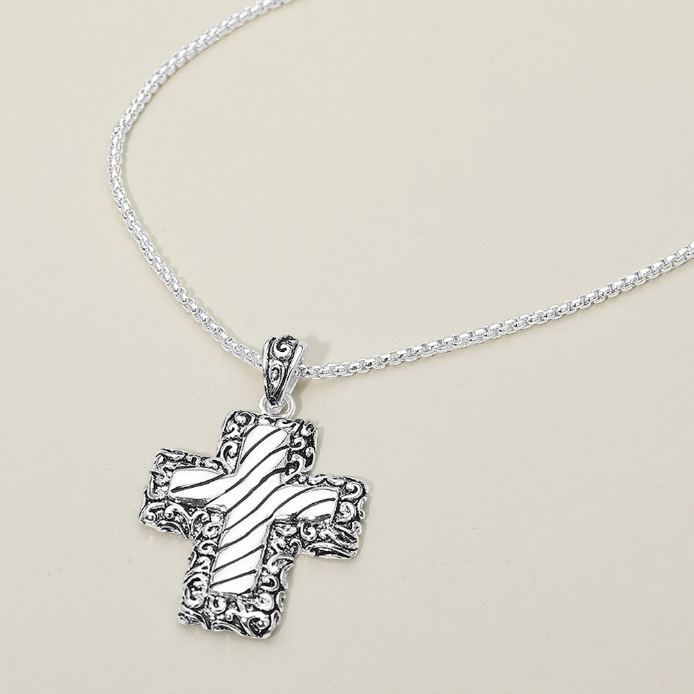 Embossed Floral Pattern Textured Metal Cross Pendant Necklace