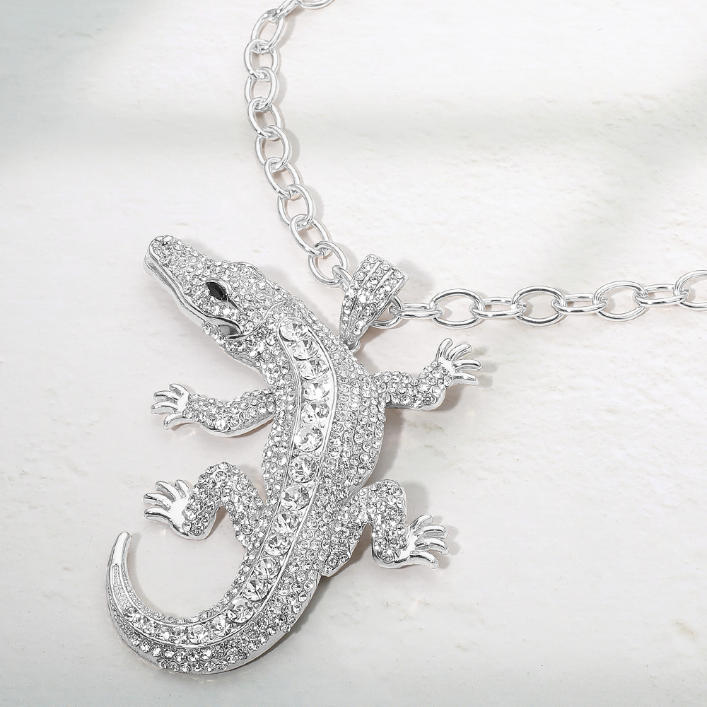 • Bold alligator pendant necklace with shimmering accents on a chunky chain. This statement jewelry piece combines edgy charm with artistic flair, perfect for fashion-forward looks or themed events, adding a fierce and captivating touch to any stylish outfit.