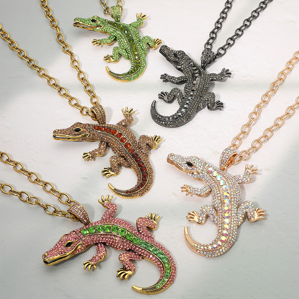 • Bold alligator pendant necklace with shimmering accents on a chunky chain. This statement jewelry piece combines edgy charm with artistic flair, perfect for fashion-forward looks or themed events, adding a fierce and captivating touch to any stylish outfit.