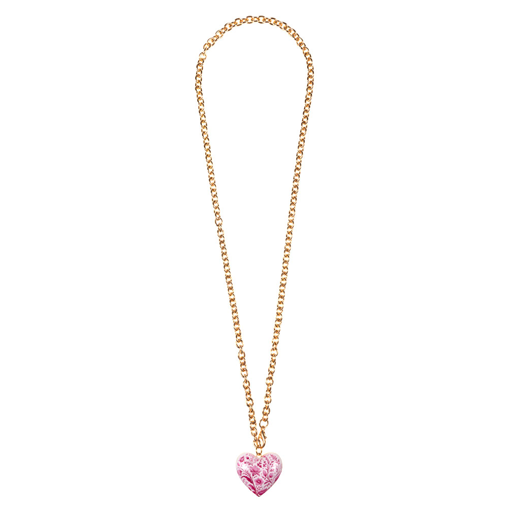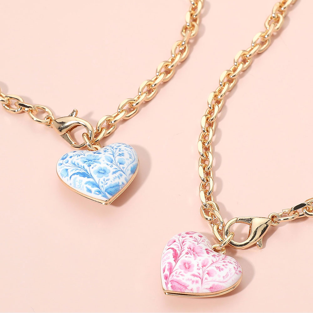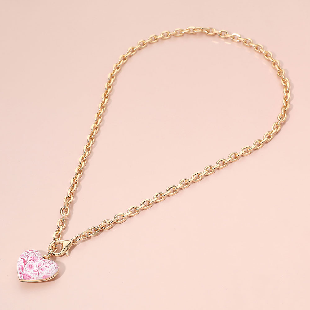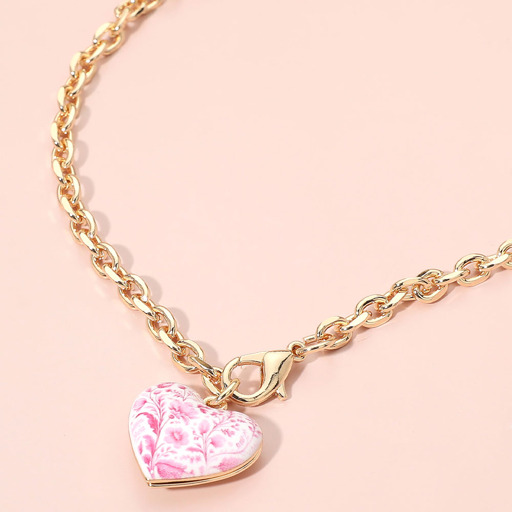 Details • Necklace Size : 18.5" L • Pendant Size : 0.8" X 0.8" • This elegant chain necklace features a delicate heart charm with a porcelain-inspired floral pattern, creating a timeless and romantic accent. Designed for effortless layering or standalone wear, it appeals to customers seeking refined, gift-ready jewelry with a soft vintage aesthetic. • Lead and Nickel Compliant