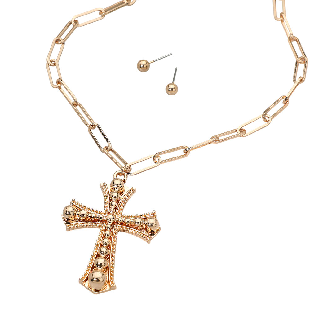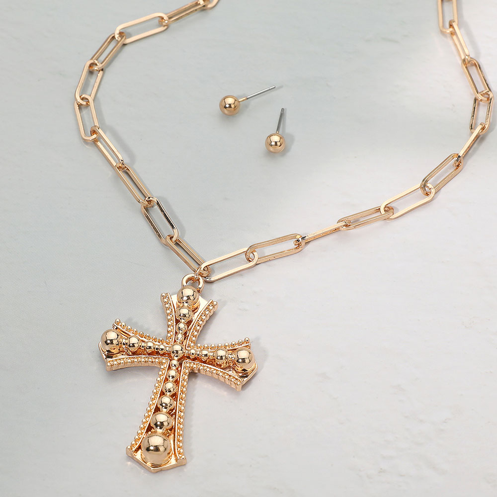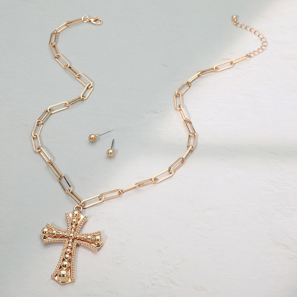 • Elegant cross pendant necklace set featuring a bold link chain and matching stud earrings. The detailed cross design adds a touch of modern sophistication, perfect for layering or statement wear, making it an ideal accessory for everyday elegance or special occasions.
