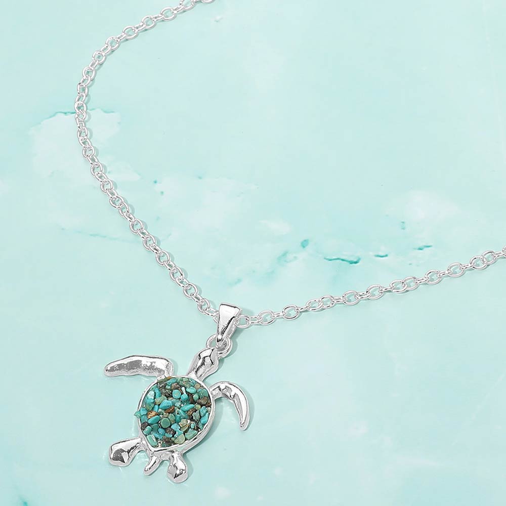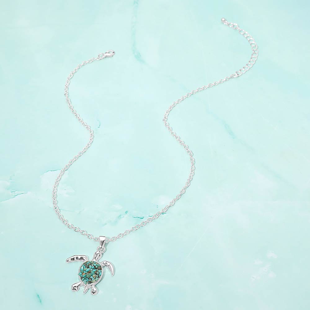 Details • Necklace Size : 18" + 3.5" L • Pendant Size : 1.25" X 1.75" • Charming sea turtle pendant necklace featuring a detailed turtle silhouette with textured inlay design on a delicate chain. Inspired by ocean themes, this necklace adds a playful yet meaningful accent to everyday outfits, vacation looks, or layered jewelry styles. A popular choice for coastal collections, gift shops, and nature-inspired accessories. • Lead and Nickel Compliant