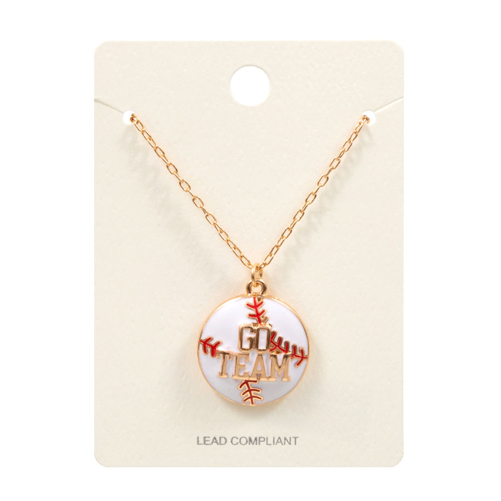Details • Necklace Size : 16.5" + 3.25" • Pendant Size : 0.8" X 0.9" • Round baseball-inspired pendant necklace featuring a bold “Go Team” design for spirited everyday styling. Ideal for game day looks, fan-focused collections, and sporty gift assortments, this necklace delivers playful team energy while remaining easy to pair with casual outfits. • Lead and Nickel Compliant