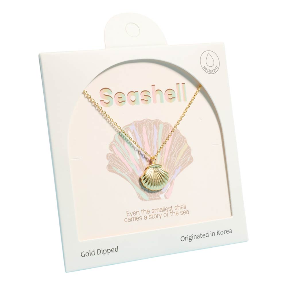 Details • Necklace Size : 16" + 2" L • Pendant Size : 0.5" X 0.5" • Charming seashell pendant necklace inspired by coastal style and ocean symbolism. Designed for everyday wear and seasonal collections, this delicate necklace adds a soft beach-inspired touch to casual outfits, resort looks, and gift assortments, making it ideal for summer displays and boutique jewelry selections. • Gold Dipped • Hypoallergenic • Made In Korea