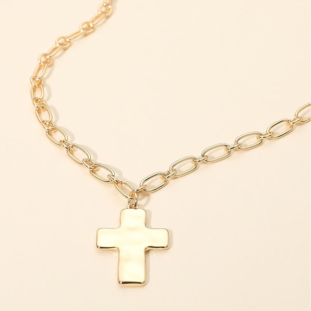 Hammered Metal Cross Pendant Paperclip Chain Necklace