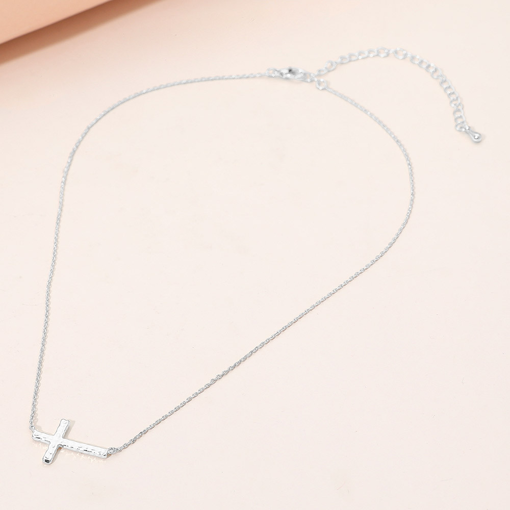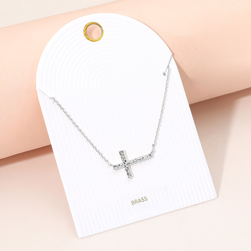 Details • Necklace Size : 15.5" + 3.5" L • Pendant Size : 0.75" X 0.6" • A modern take on a timeless symbol, this sideways cross pendant necklace adds subtle elegance and meaning to any look. Its sleek design and delicate chain make it perfect for layering or wearing alone, offering a refined statement of faith and contemporary sophistication. • Brass • Lead and Nickel Compliant