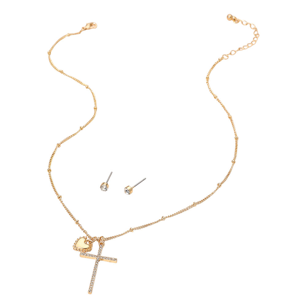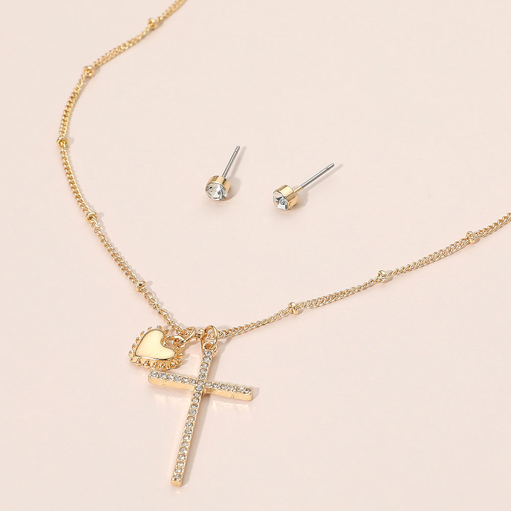 • Add meaningful elegance to your look with this delicate pendant necklace featuring a heart and cross charm, paired with classic stud earrings. Perfect for everyday wear or special moments, this set brings a subtle shine and thoughtful style to any outfit.