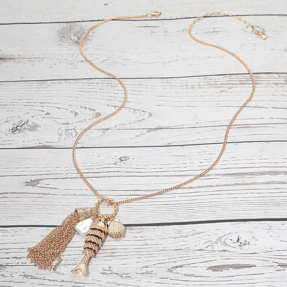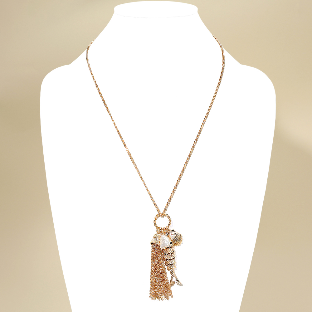 Details • Necklace Size : 23" + 3.25" L • Pendant Size : 3.25" L • This tassel charm pendant long chain necklace features a statement drop with layered charms and fluid fringe movement. Designed to elevate everyday outfits or boutique collections, it offers a bold yet elegant silhouette that works for gifting, seasonal styling, and trend-forward accessorizing. • Lead and Nickel Compliant