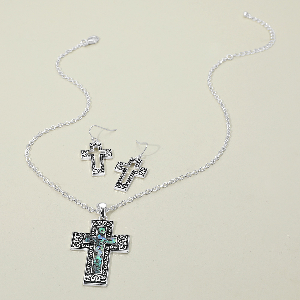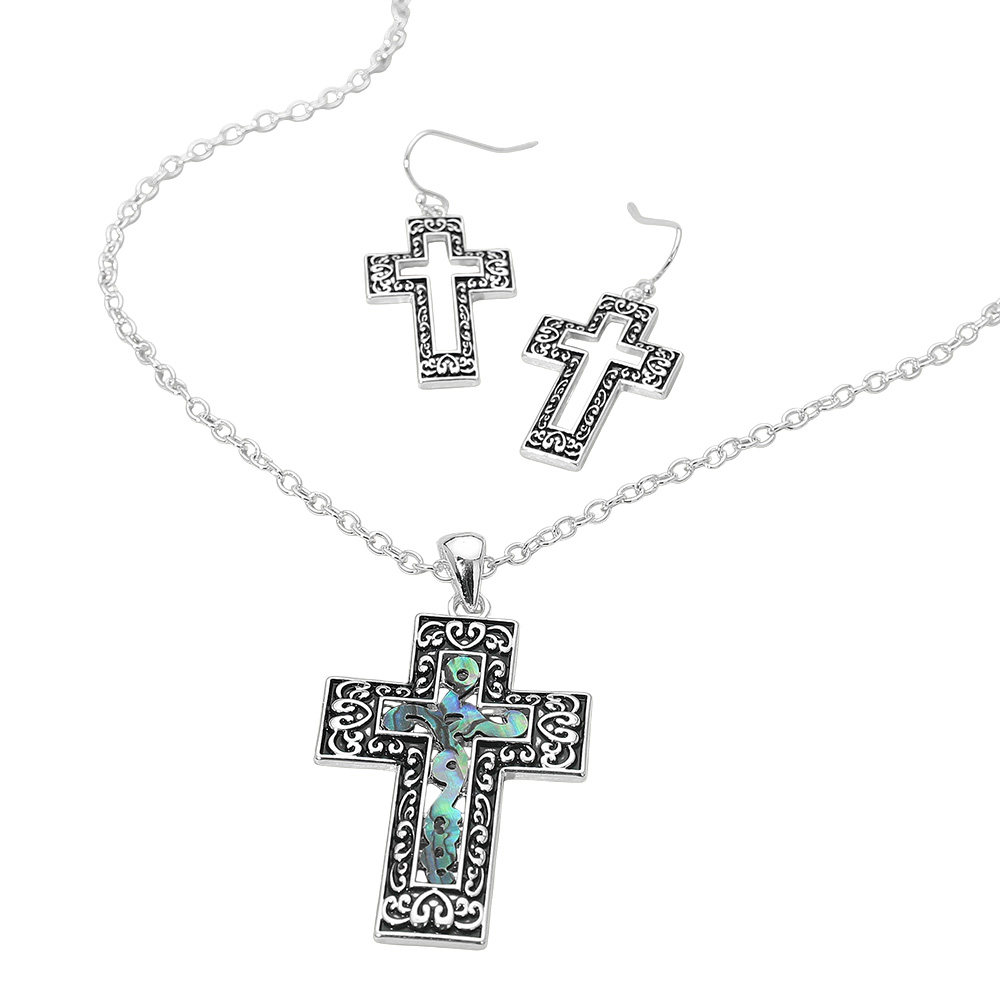 Details • Necklace Size : 18" + 3.5" L • Pendant Size : 1.3" X 2.4" • Earrings Size : 1.6" L • This abalone cross pendant and earring set combines intricate scrollwork with a luminous finish for a timeless look. The detailed craftsmanship and classic design offer a refined, meaningful accessory that adds elegance and grace to any style. • Lead and Nickel Compliant