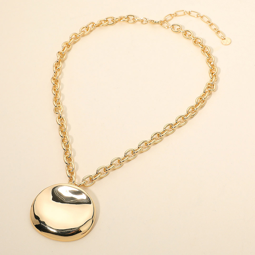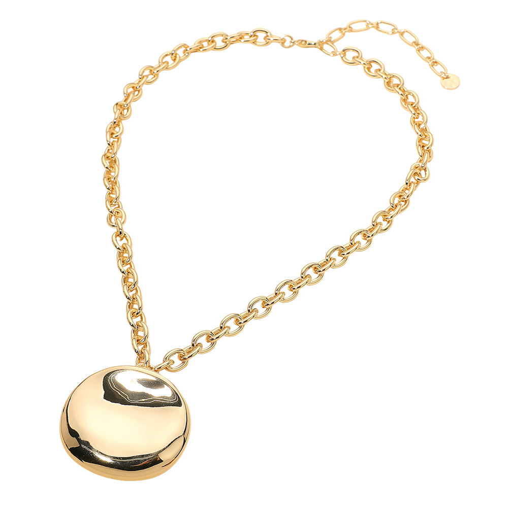 • A sleek necklace featuring a bold round pendant suspended from a refined chain, offering a modern yet timeless statement. Its smooth, radiant finish elevates everyday outfits and special-occasion looks alike, making it a versatile accessory that adds effortless sophistication.